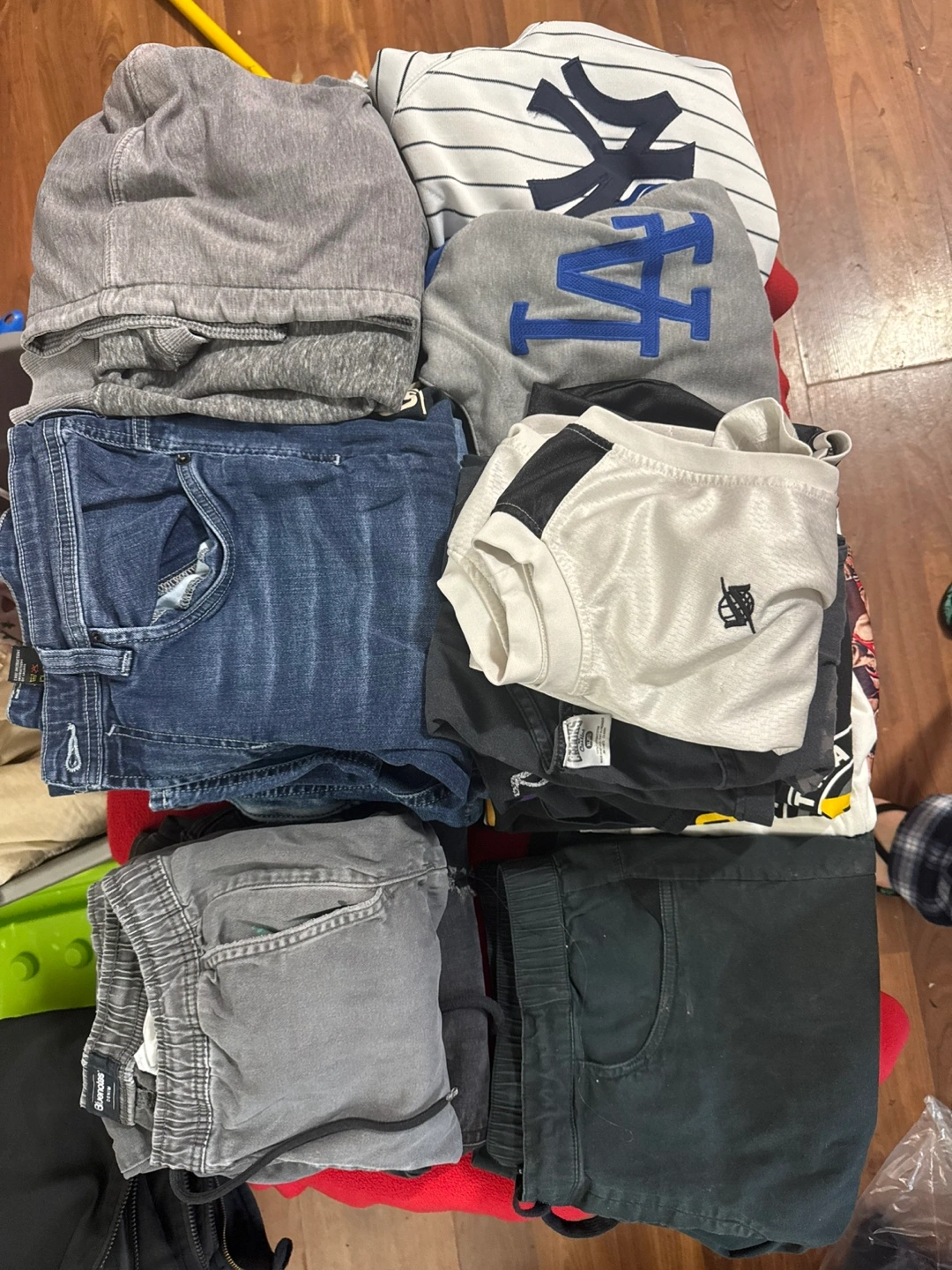 A mixed lot of mens clothing including jeans, shirts, and sweaters.