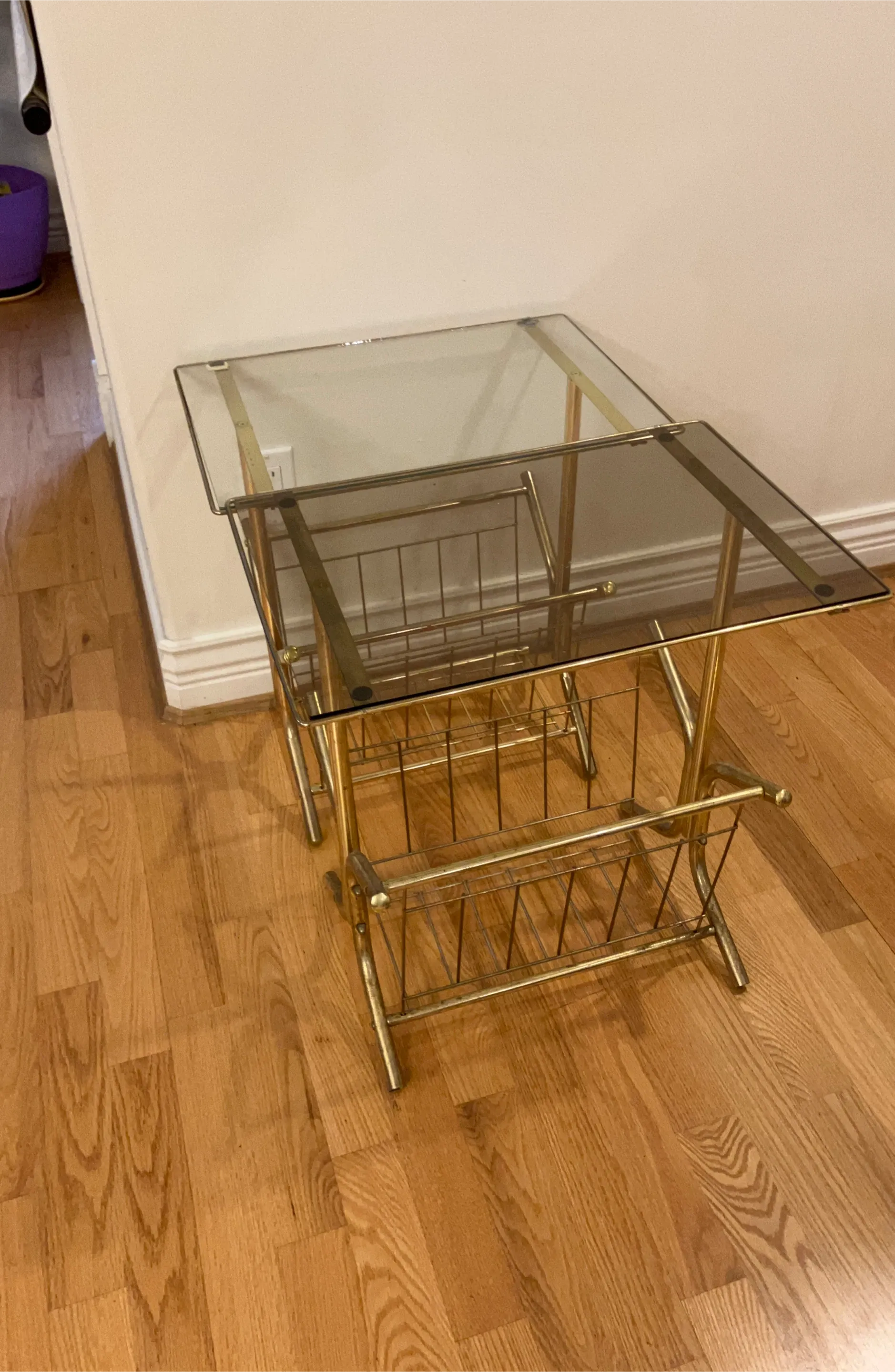 MOVING SALES ~ Cash only/door pick up (Near PNE)- Selling a neat vintage side table with a magazine rack! It has a gold metal frame and a glass top. It's in good condition and would be a great addition to any living room or den (two Tables for $20)