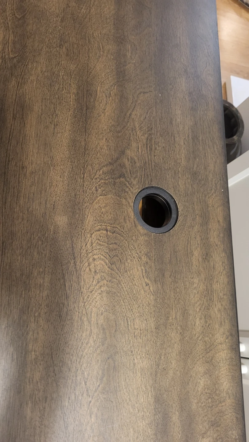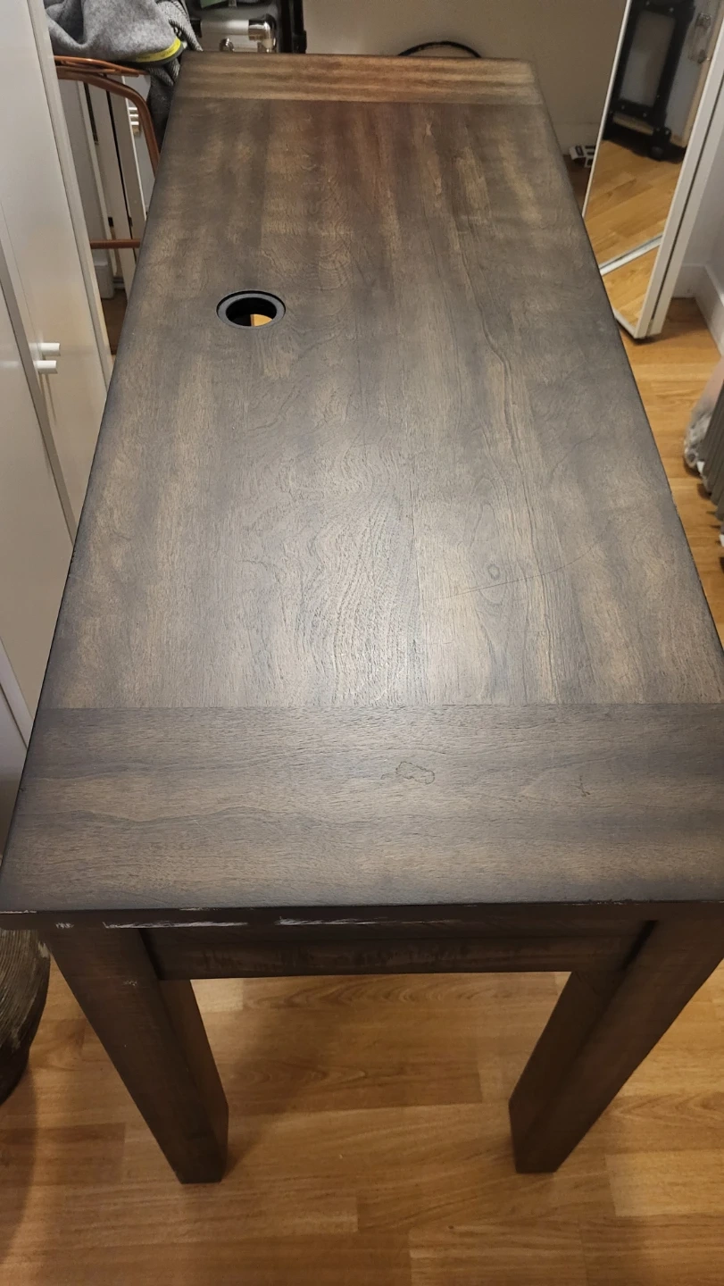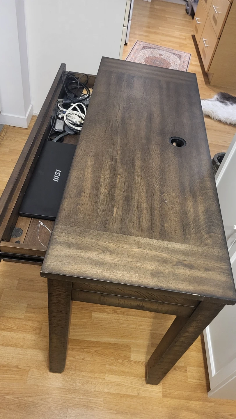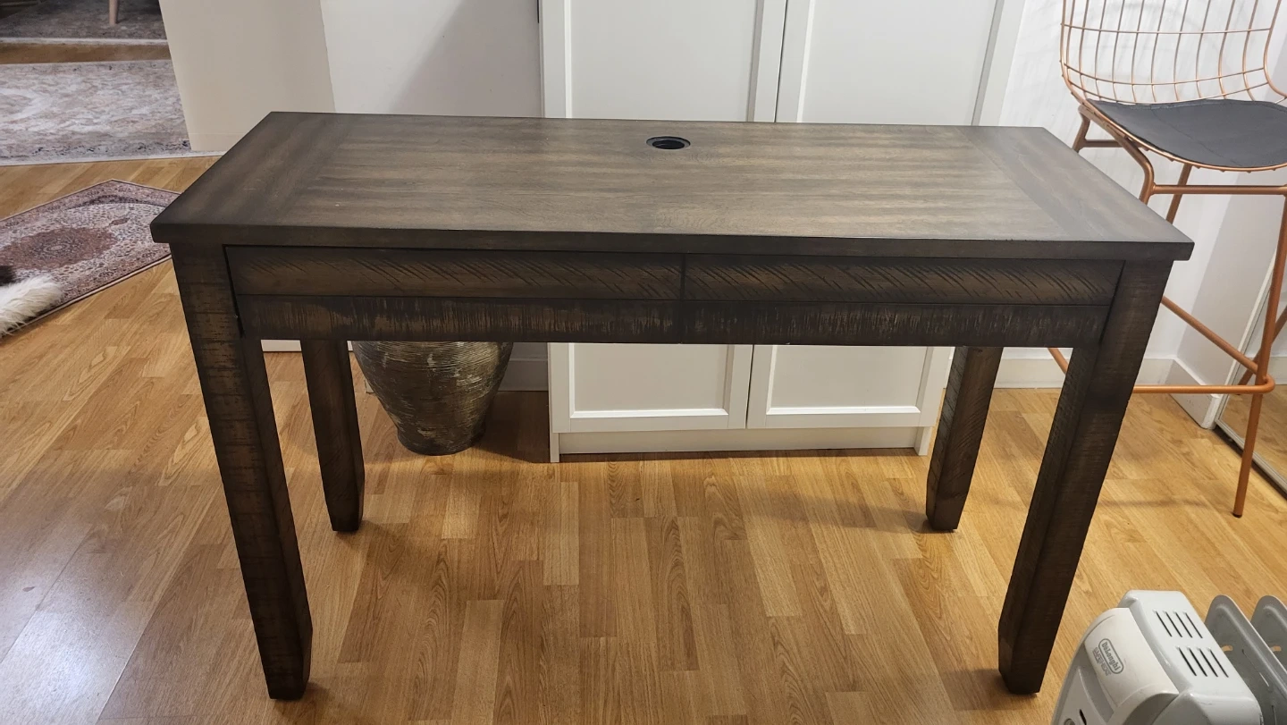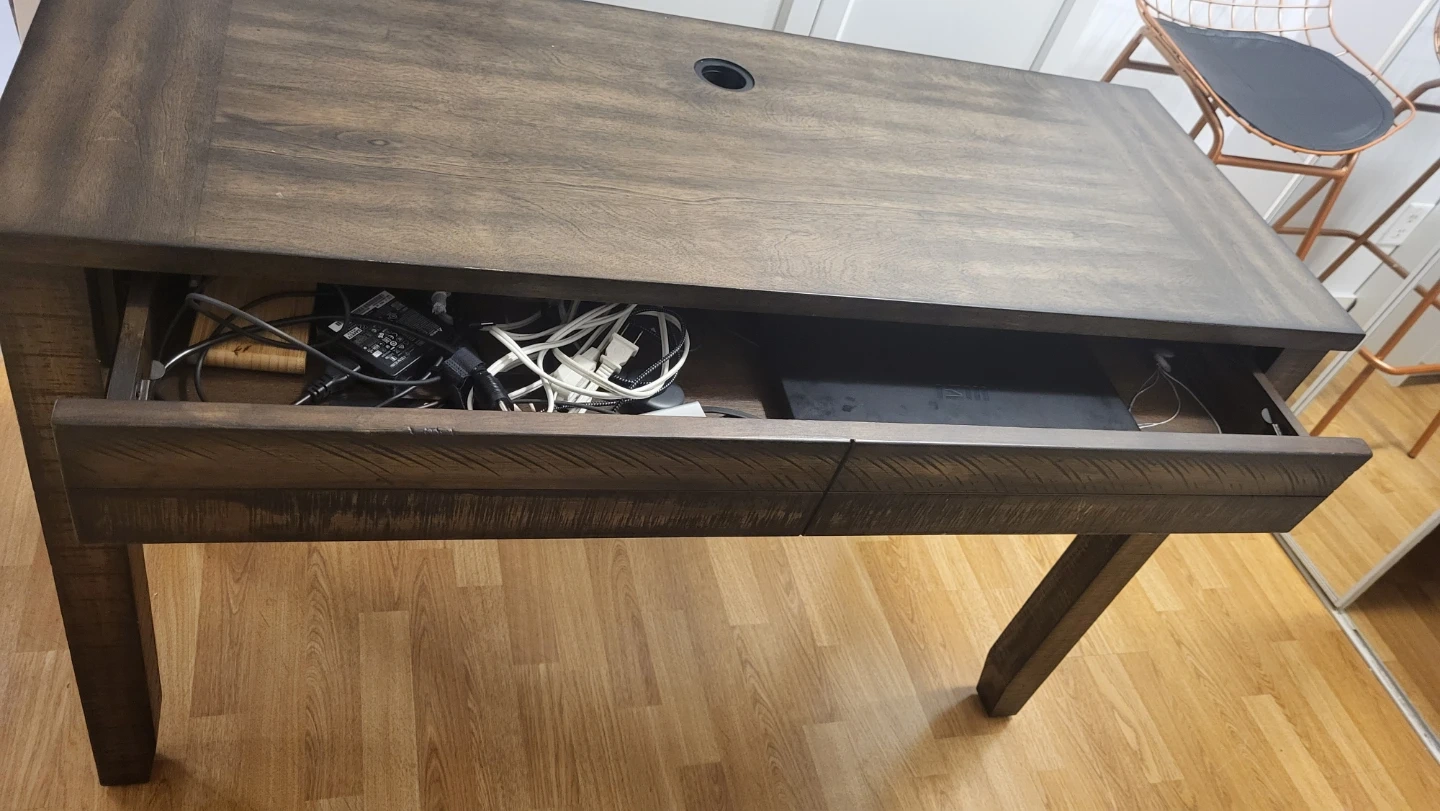 This dark wood desk features a convenient cable management hole on the surface. It has two drawers for storage, perfect for keeping your workspace tidy. The distressed wood finish gives it a rustic look.