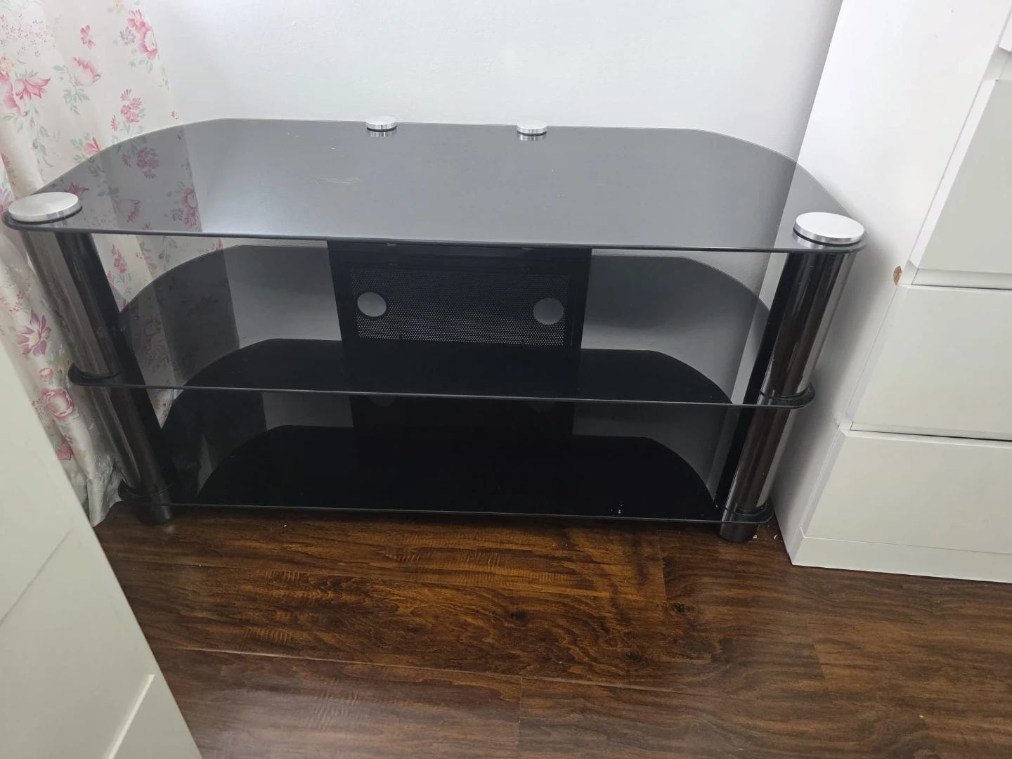 This black glass TV stand features three tiers for storing media components. It has a sleek, modern design and is made from durable tempered glass with chrome accents. The open shelving provides easy access and ventilation for your electronics.