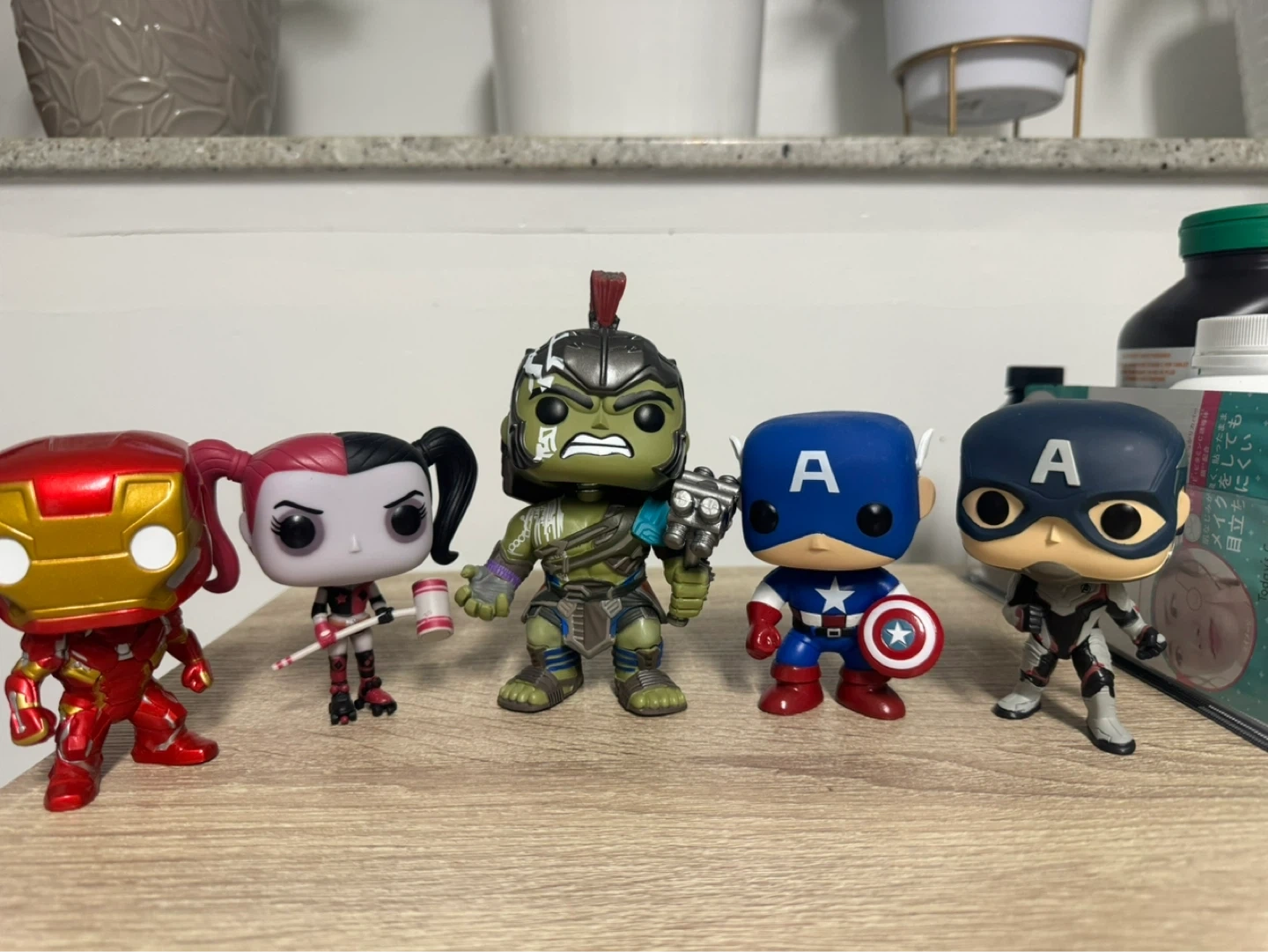 Collection of five Funko Pop! figures featuring Iron Man, Harley Quinn, Thor Ragnarok Hulk, Captain America, and a Marvel character. These vinyl figures are great for display.