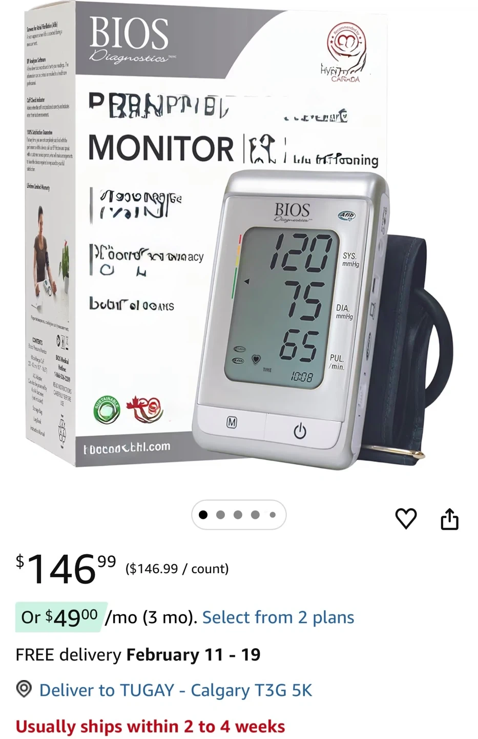 Selling a BIOS Diagnostics Blood Pressure Monitor with Atrial Fibrillation Screening. It's the #1 Canadian Blood Pressure Manufacturer.