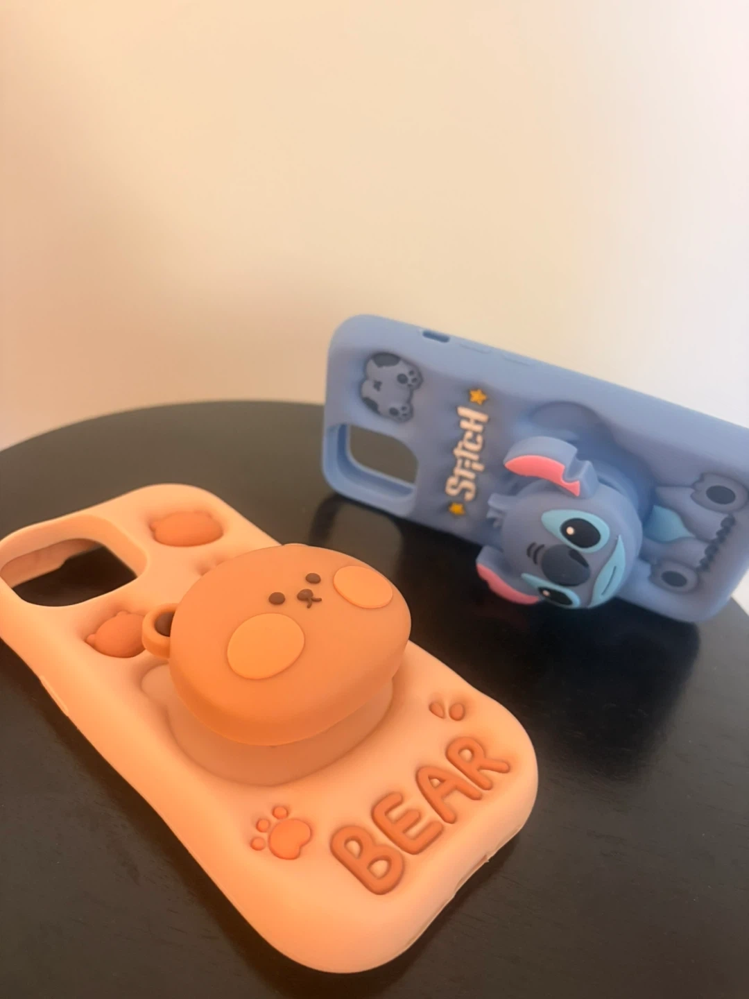 Adorable phone cases featuring a brown bear and Stitch! Soft silicone material, and the heads are pop sockets, for good grip. Protect your phone with some fun!