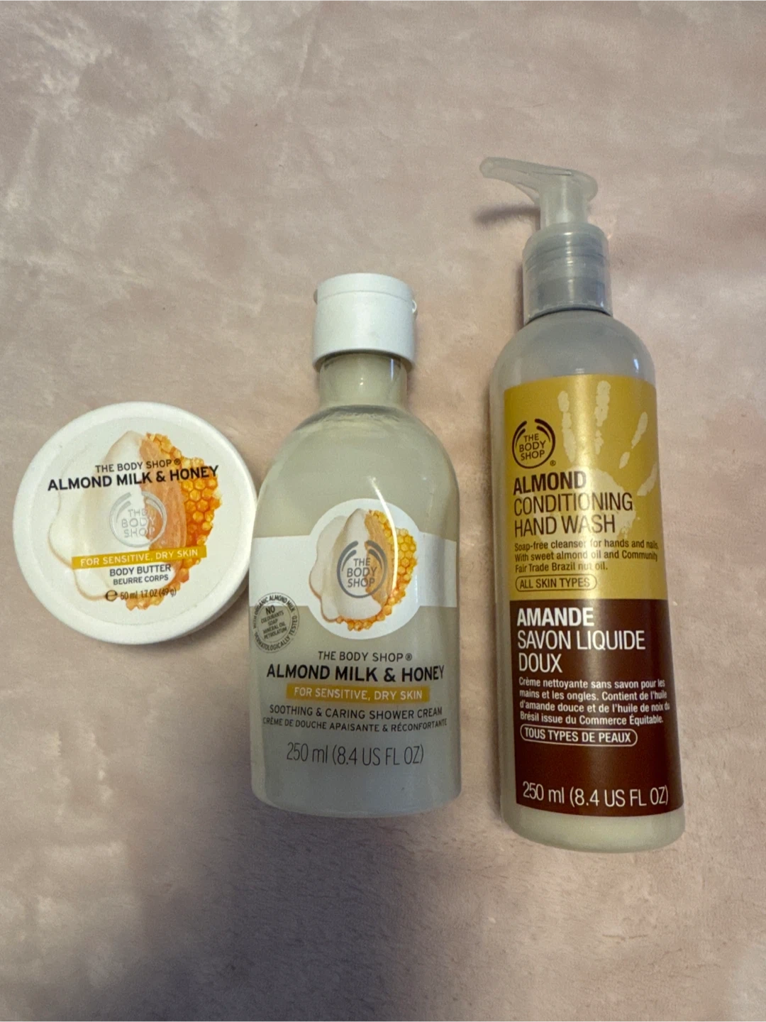 This set includes The Body Shop's Almond Milk & Honey Body Butter (50 ml), Soothing & Caring Shower Cream (250 ml), and Conditioning Hand Wash (250 ml). They're formulated for sensitive, dry skin and all skin types respectively.