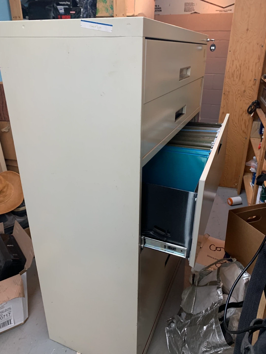 This is a metal filing cabinet with 3 legal file drawers. Two on top conveniently hold supplies. It's beige and has silver handles. Many files are included.