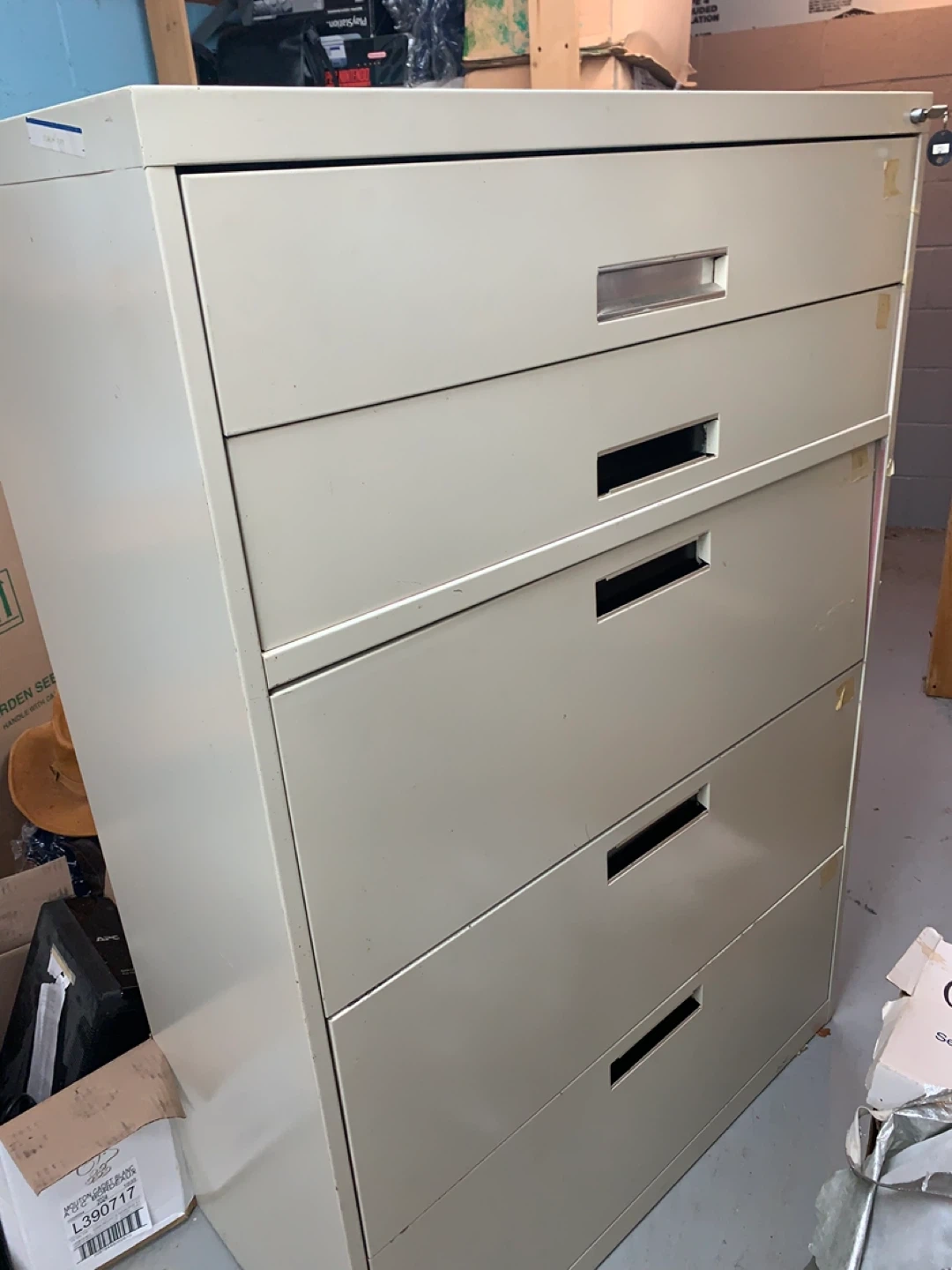 This is a metal filing cabinet with 3 legal file drawers. Two on top conveniently hold supplies. It's beige and has silver handles. Many files are included.