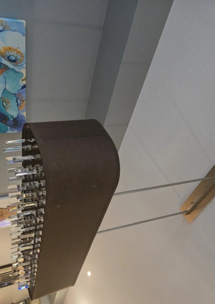 A pretty light brown satin shade with crystals - rectangular in excellent condition great over a diningroom table.