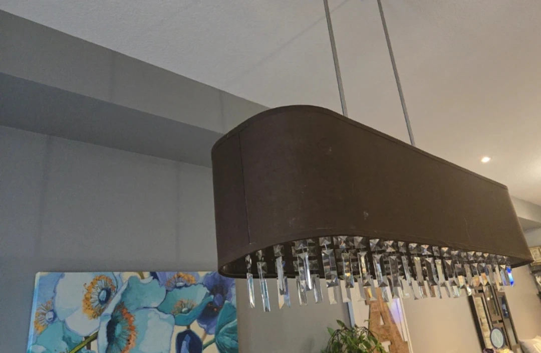 A pretty light brown satin shade with crystals - rectangular in excellent condition great over a diningroom table or long Island in kitchen.