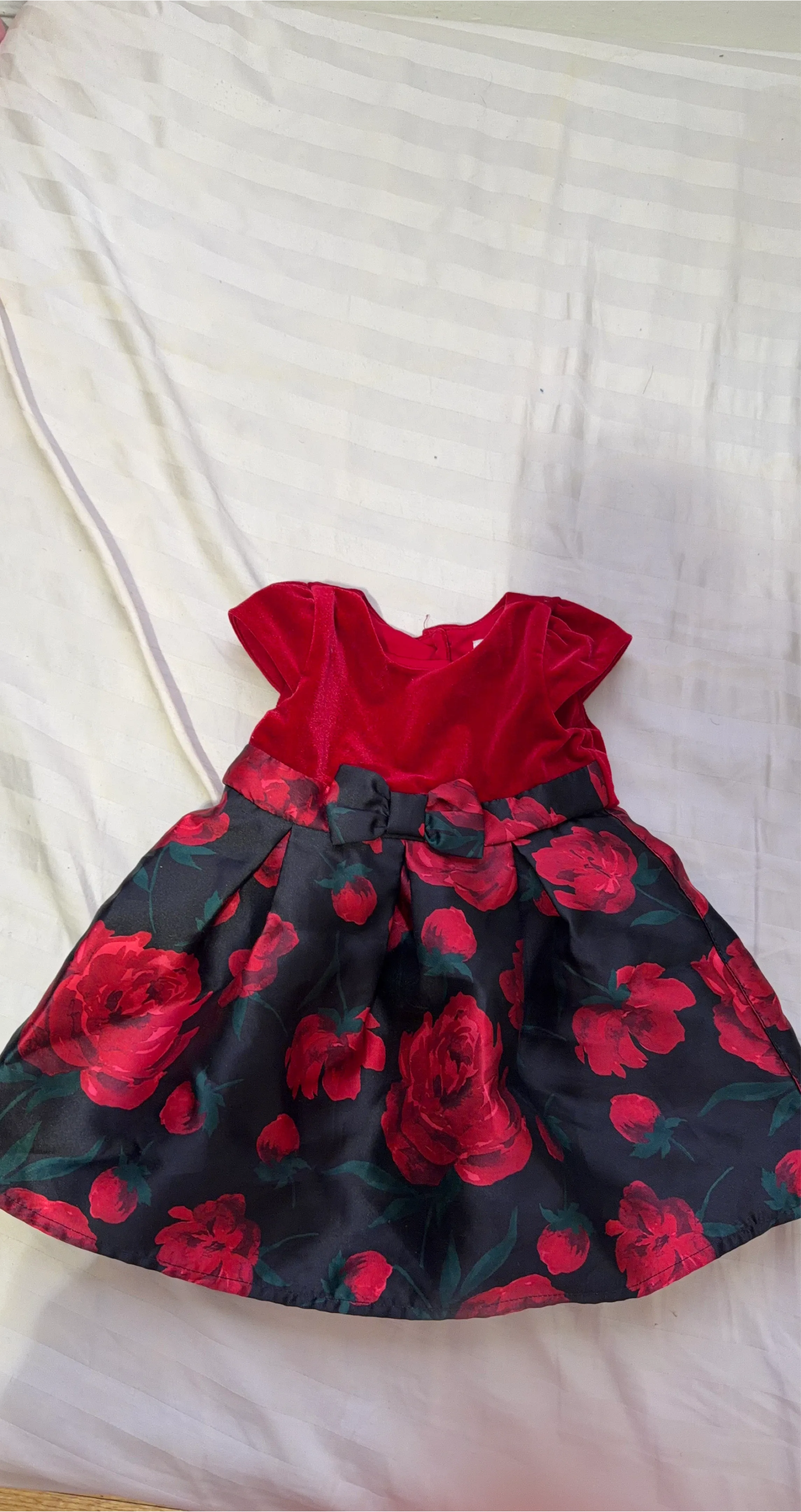 Beautiful girls' dress with a red velvet bodice and a black skirt featuring a vibrant red floral print. It has short sleeves and a bow detail at the waist. Perfect for special occasions!