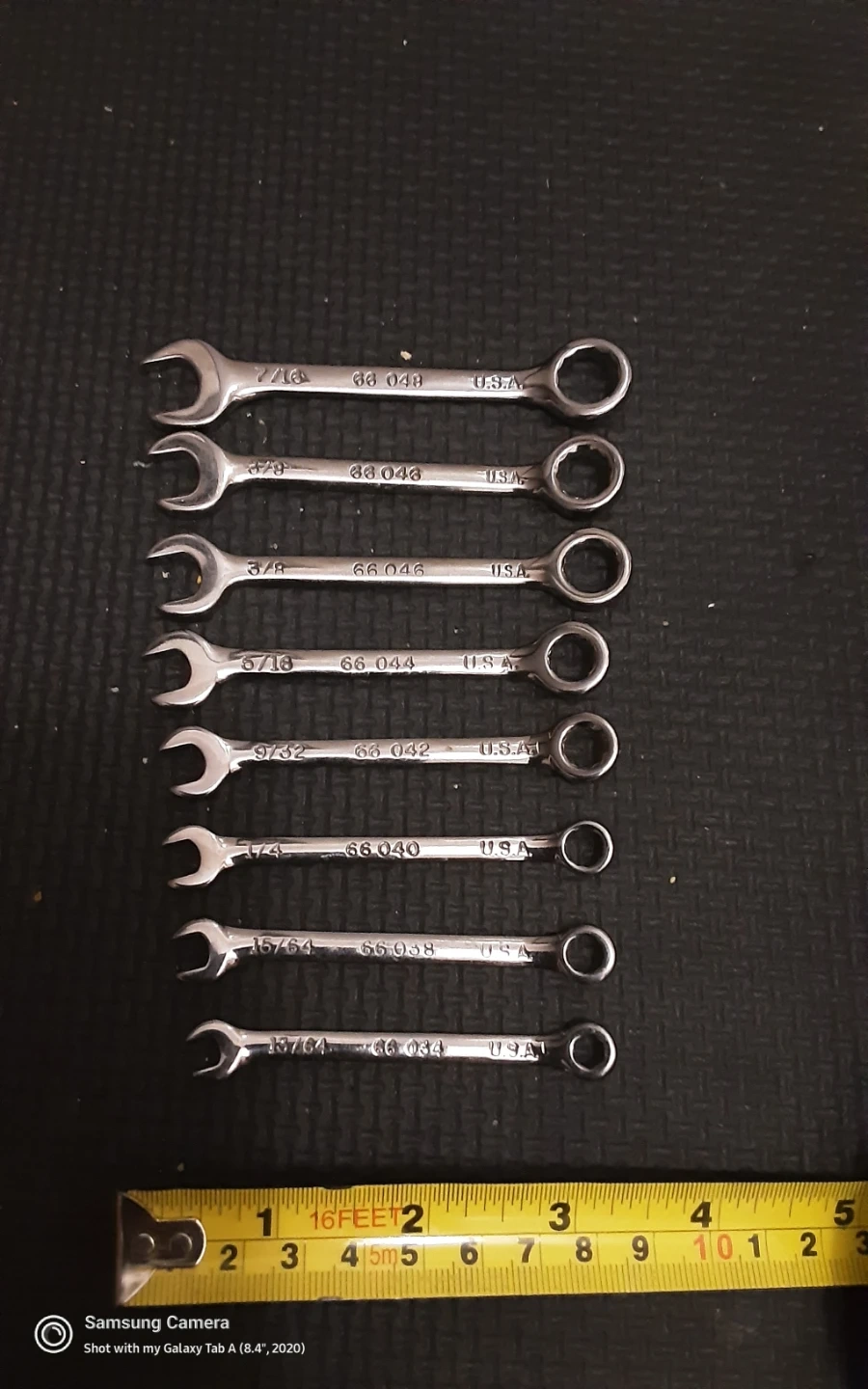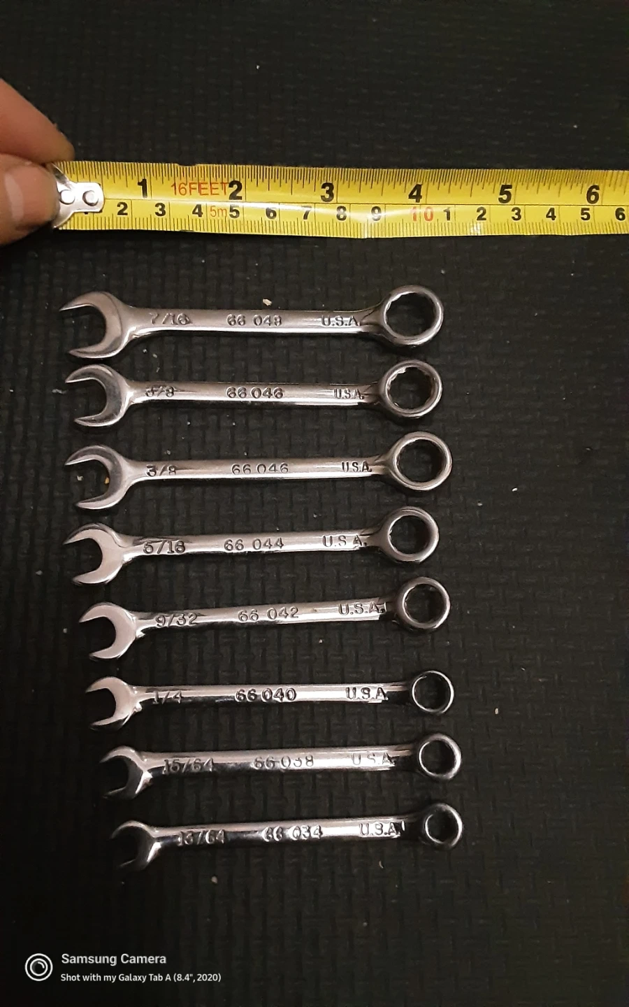 Set of 8 combination wrenches made in the U.S.A. Includes sizes 7/16, 3/8, 5/16, 9/32, 1/4, 15/64, and 13/64. These wrenches are handy for various mechanical tasks. Unique.
