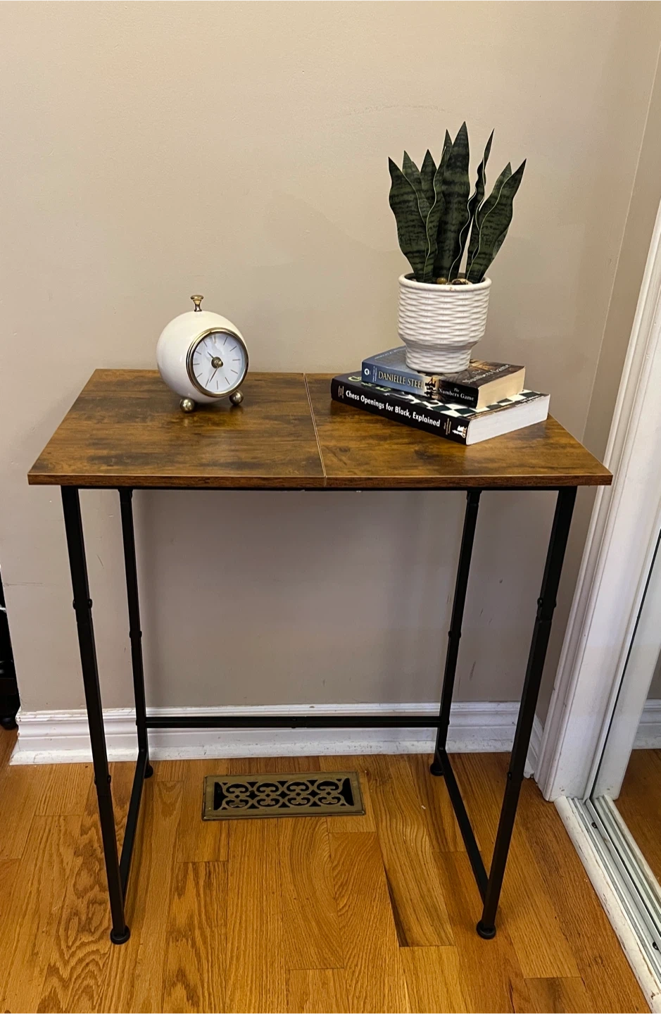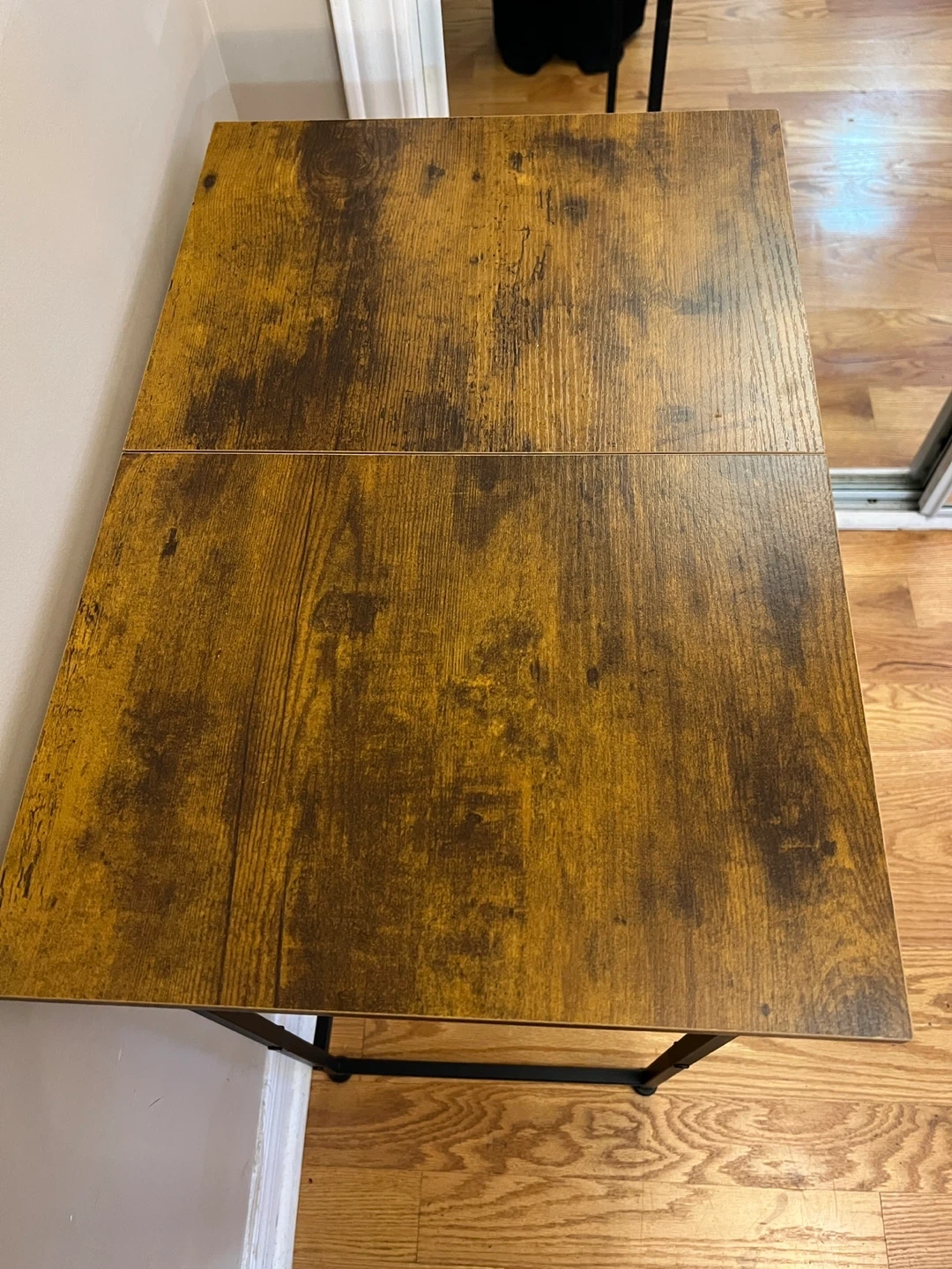 Brand New fully assembled console/hallway table with a brown wood-look top and black metal legs.