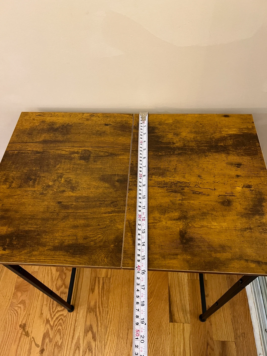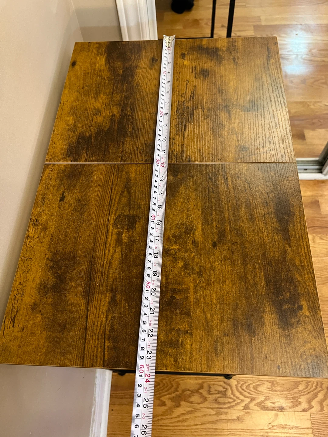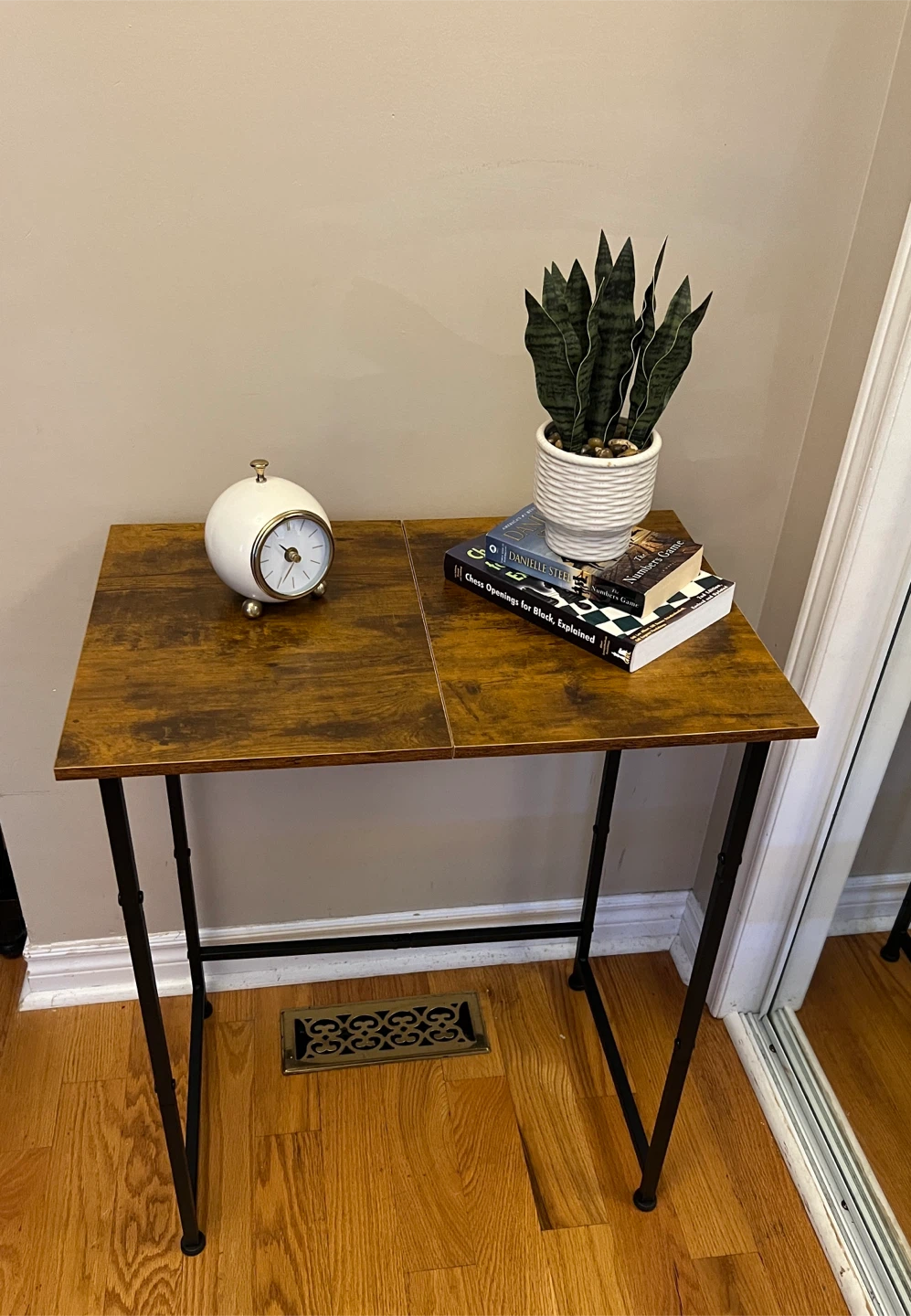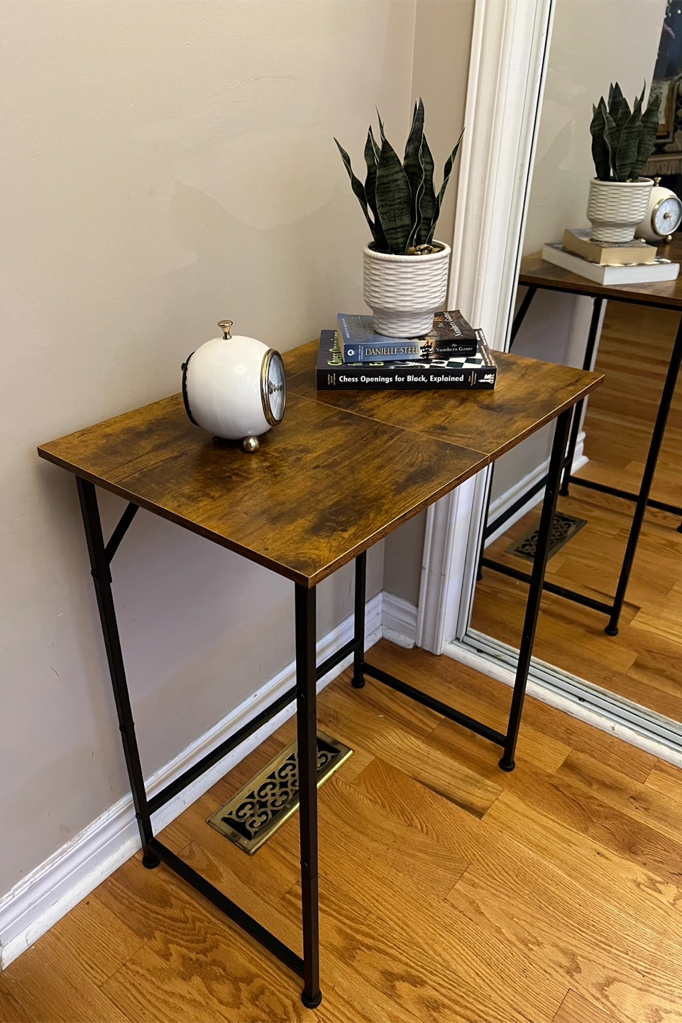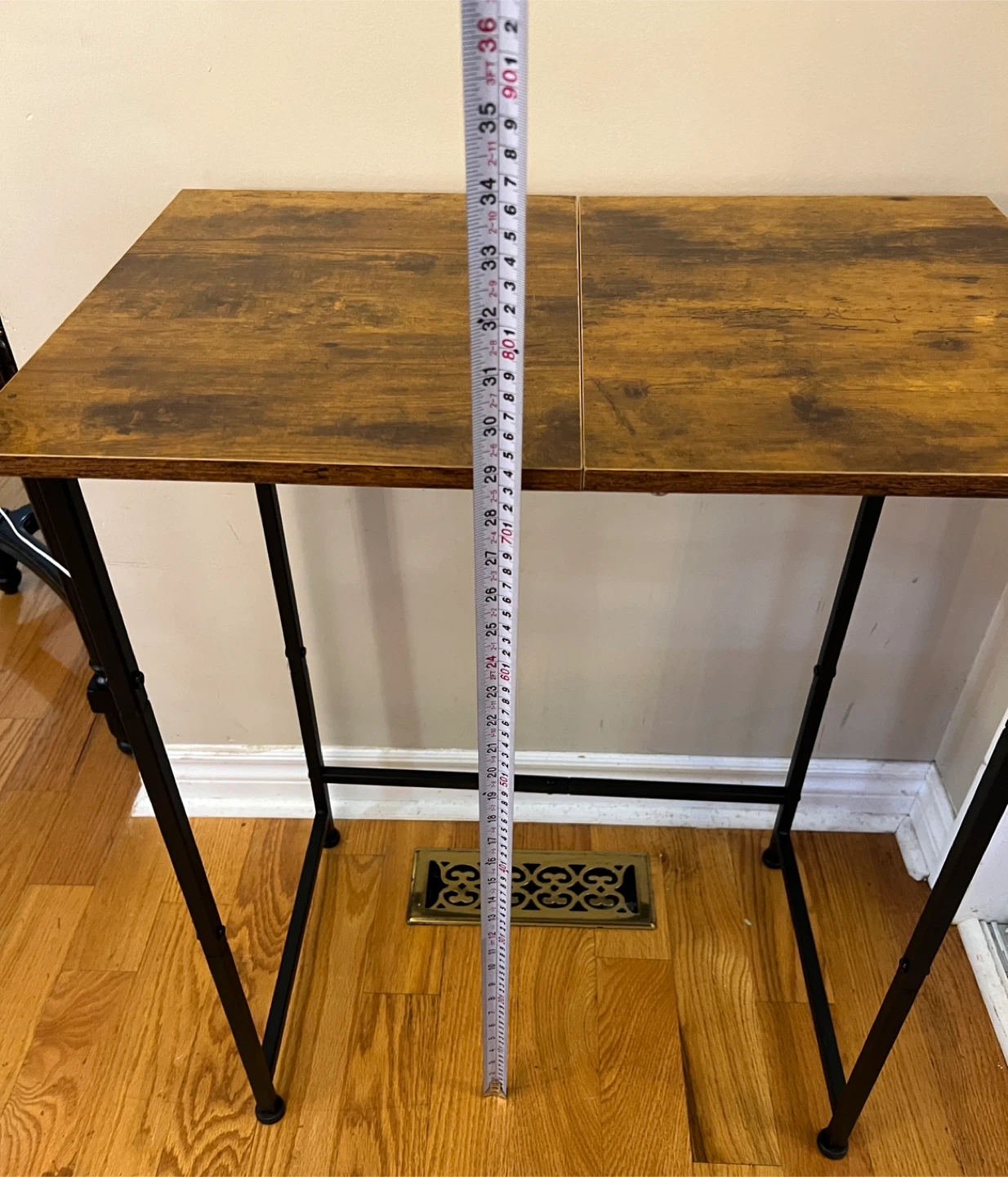 Brand New fully assembled console/hallway table with a brown wood-look top and black metal legs.