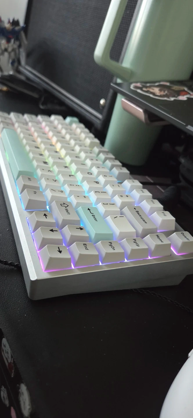 Stock princess mmd ultra thock switches and doubleshot pbt cherry keycaps.