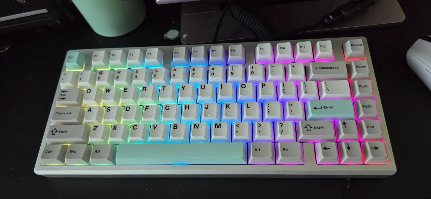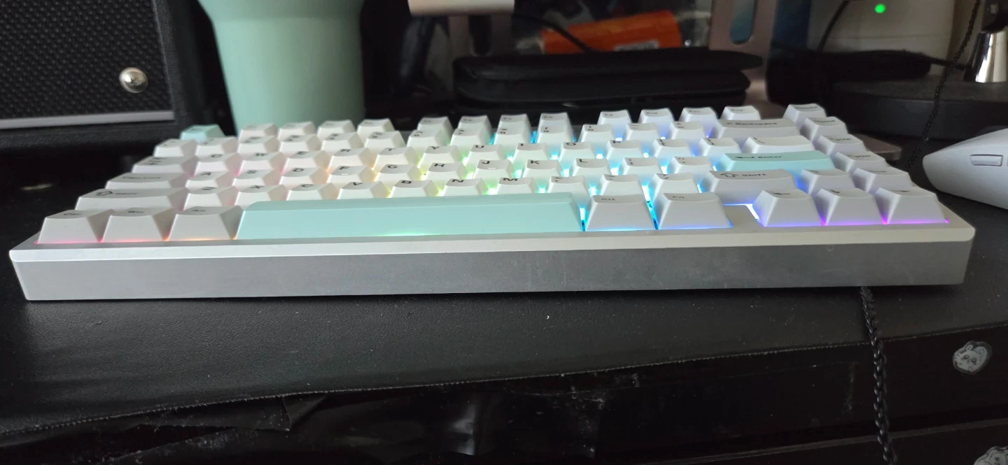 Stock princess mmd ultra thock switches and doubleshot pbt cherry keycaps.