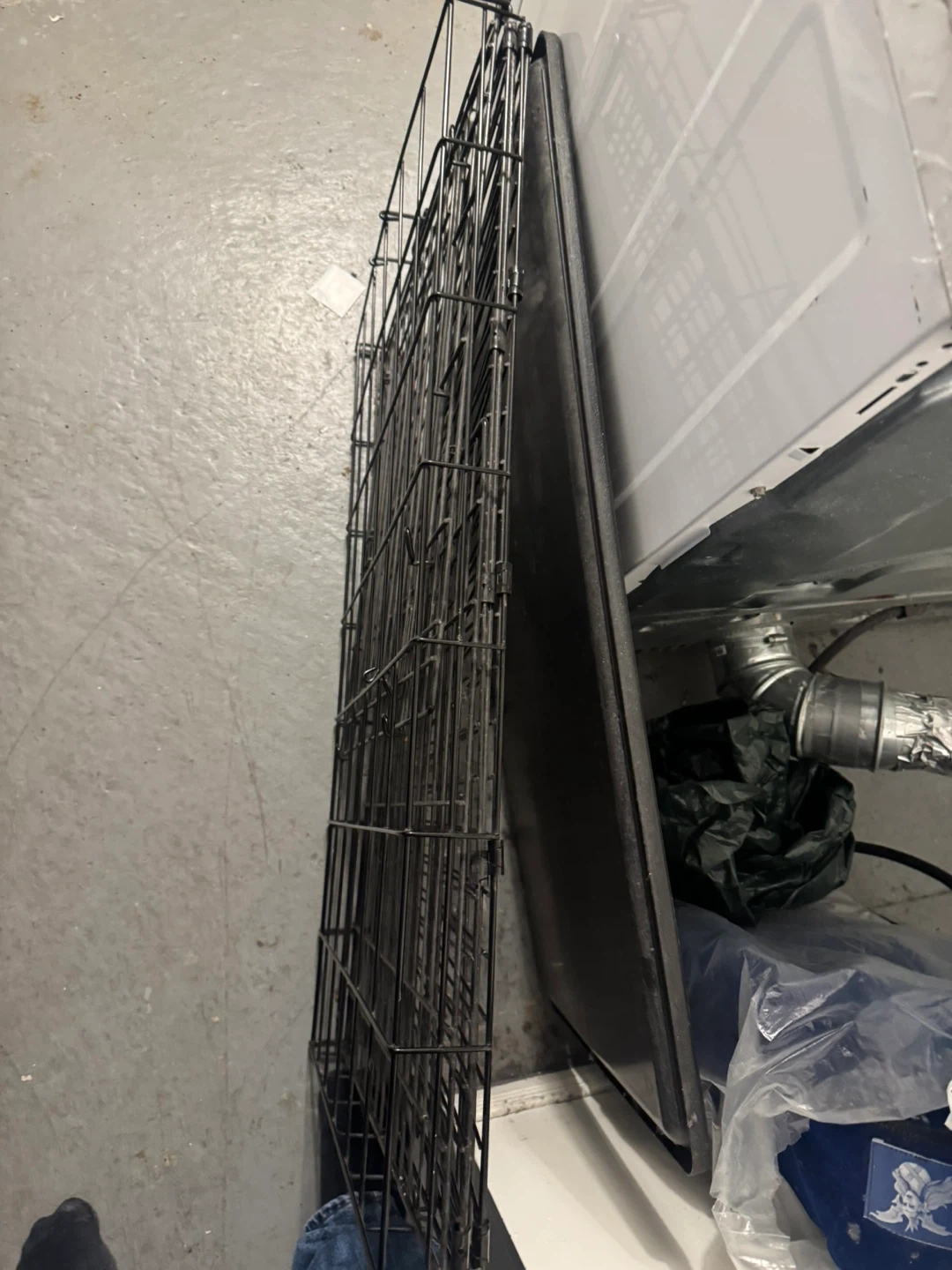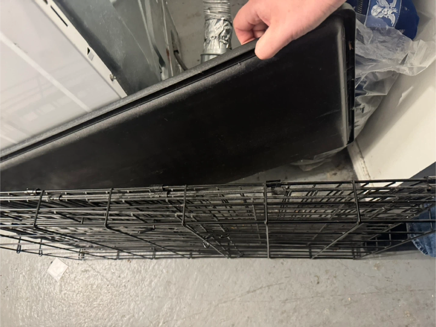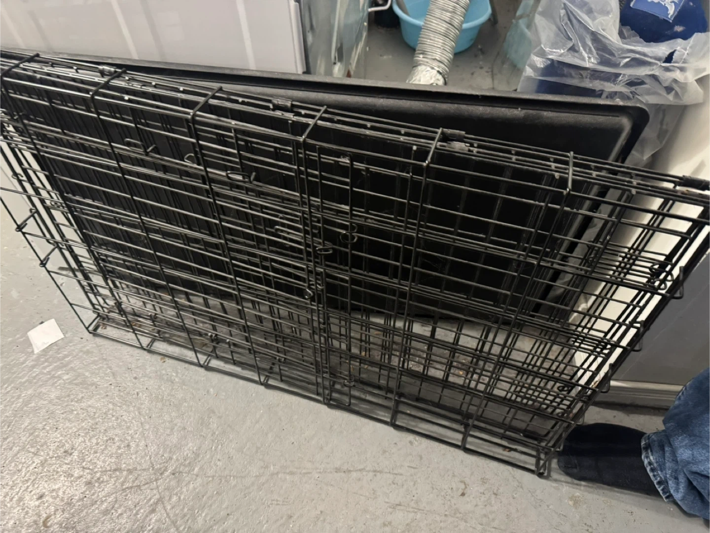 This is a wire cat crate with a black plastic bottom tray. It's a sturdy and reliable option for housing your pet. The tray makes cleaning up easy!
