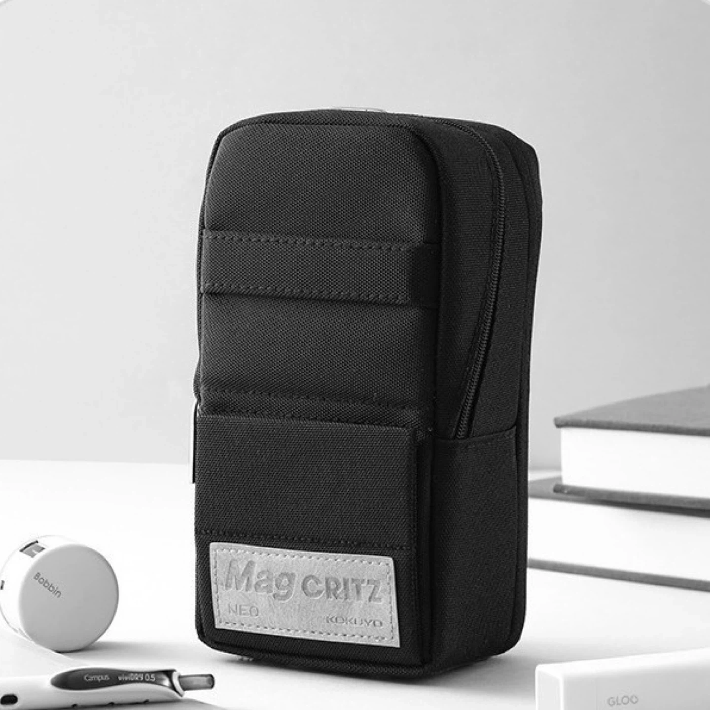 This Kokuyo Mag Critz NEO pencil case is black. It's a fabric construction with a zippered main compartment. The case has a front pocket for quick access.