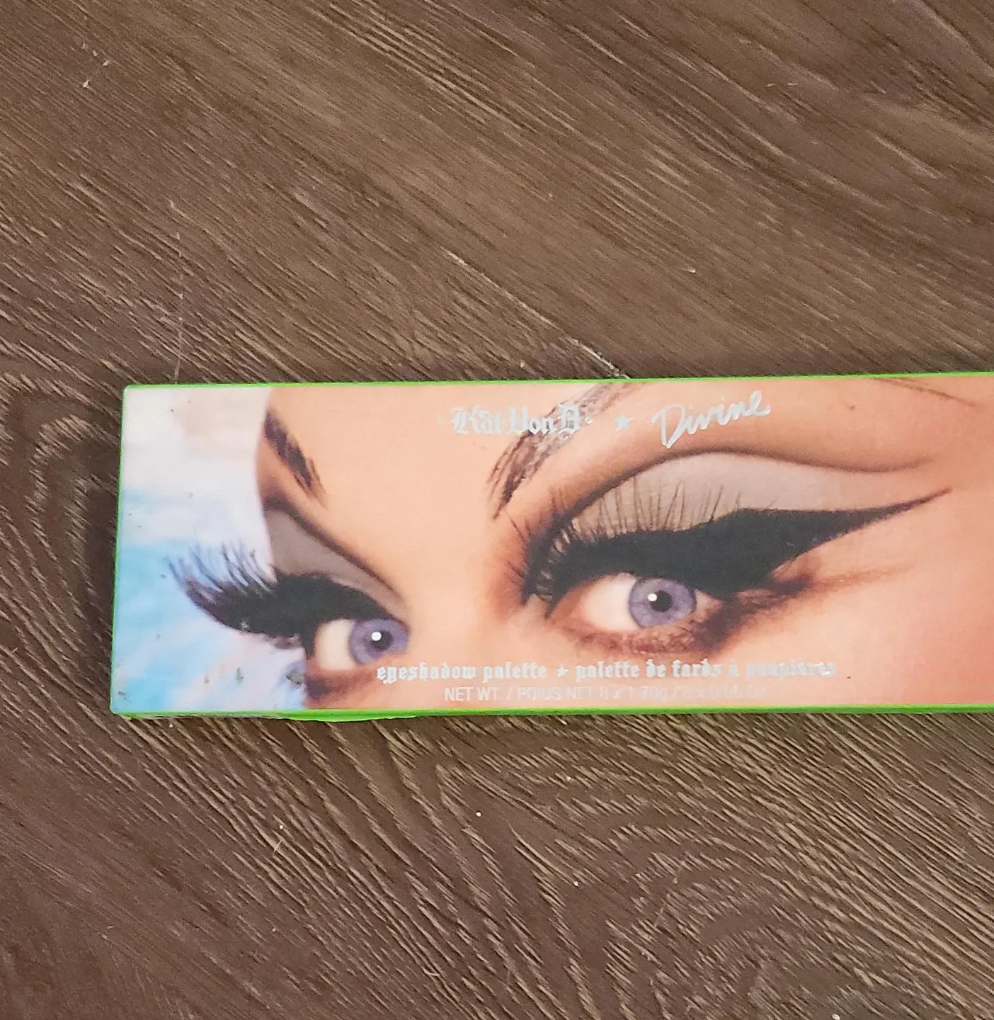 This Kat Von D Divine eyeshadow palette includes the shades Babs, Hard Magic, Baltimore, Waters, Filthy, Pink Flamingos, Female Trouble, and Hairspray. It's an eyeshadow palette with a net weight of 8.2g (0.29 oz).