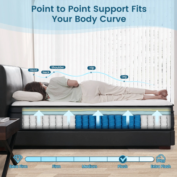 This mattress is designed for a comfortable night's sleep! It features breathable knitted fabric, safety fireproof foam, soft memory foam, and breathable foam. The edge high density foam and enhanced pocket spring provide point-to-point support that fits your body curve. It's also skin-friendly and provides softness
