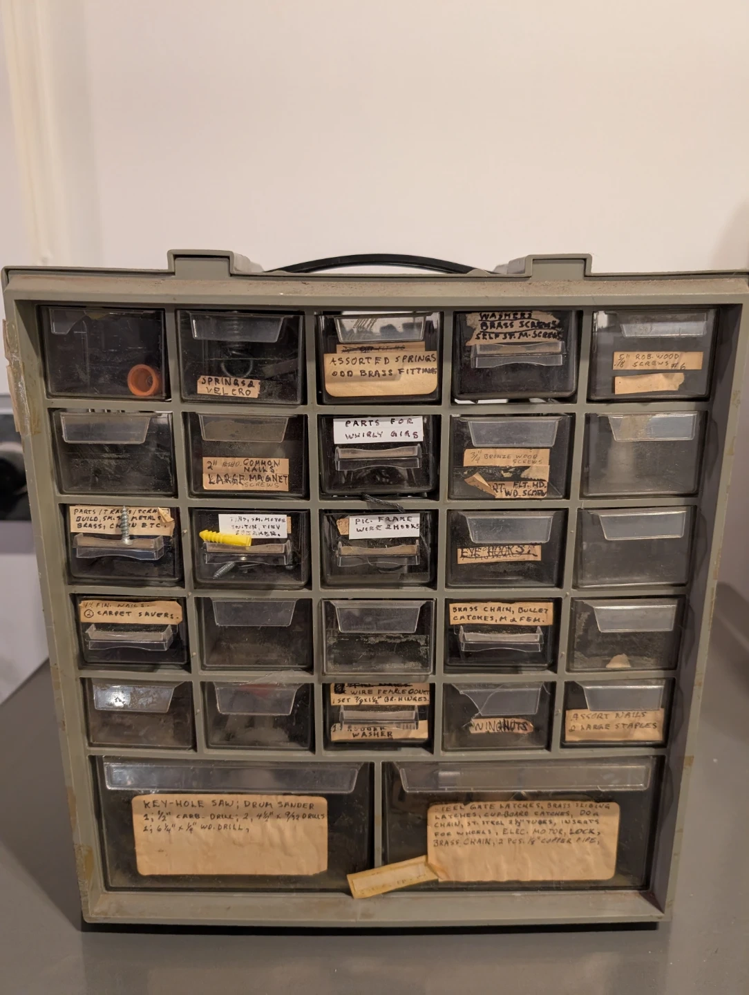 This is a grey multi-drawer storage cabinet filled with various hardware. It includes assorted springs, brass fittings, screws, nails, washers, and more.