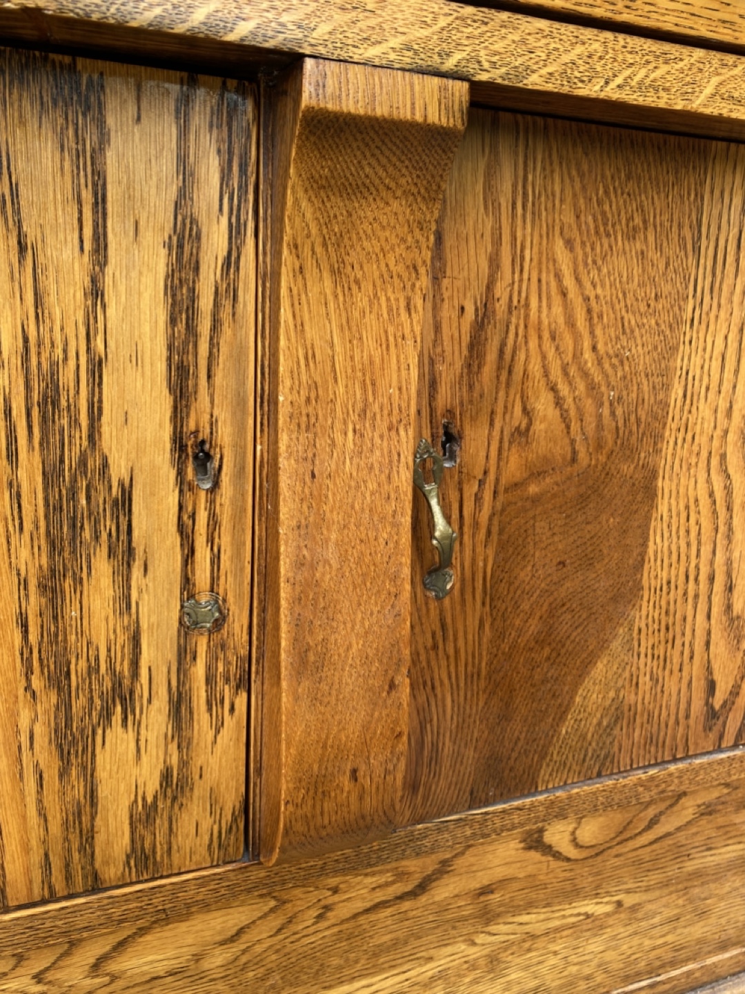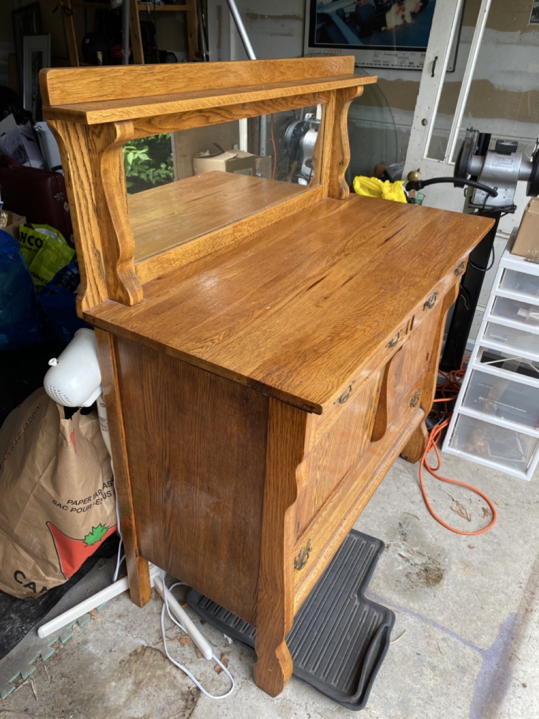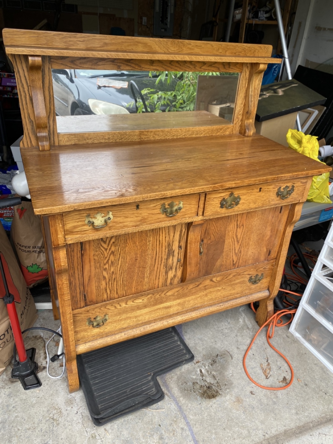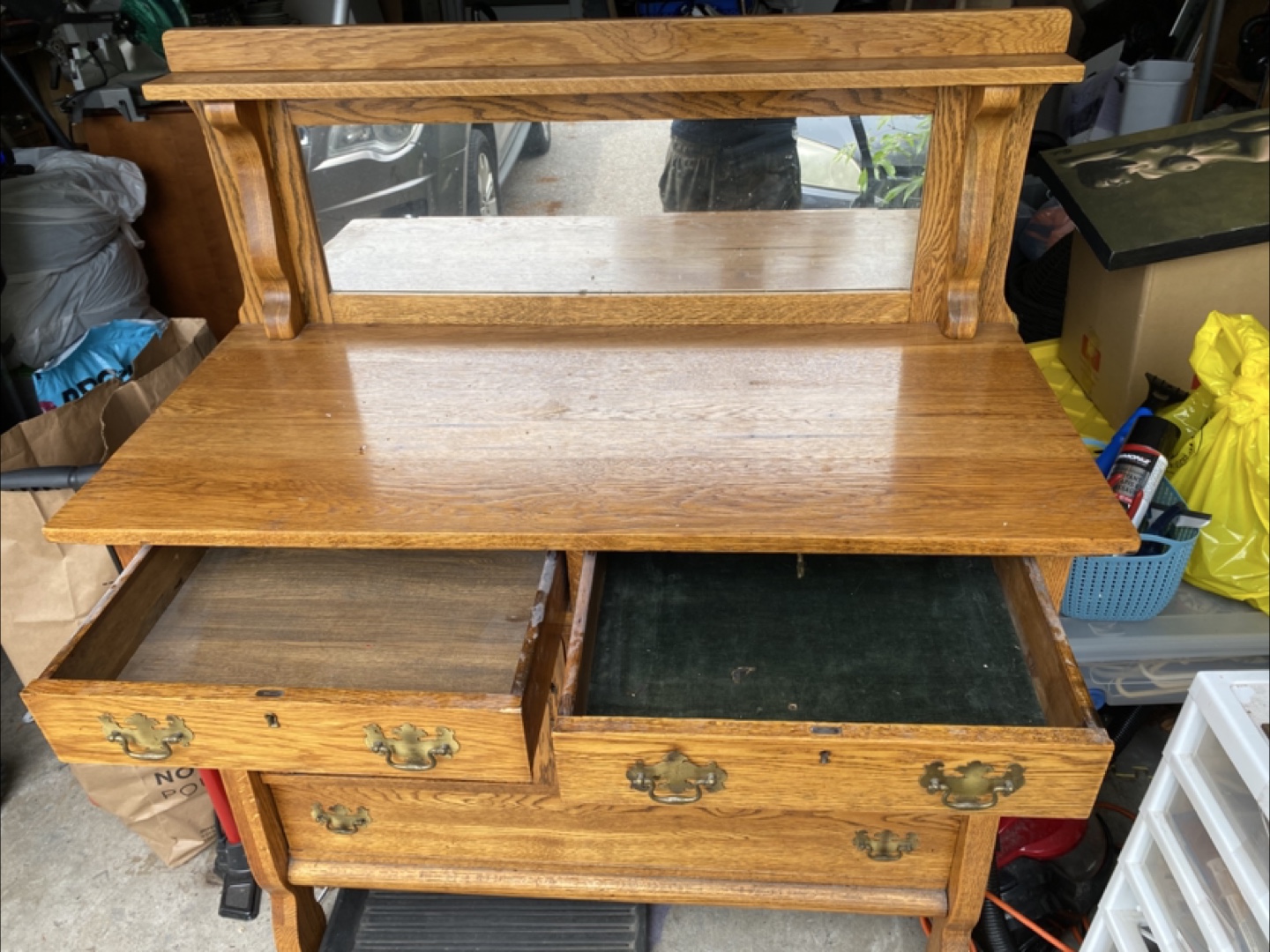 Selling an antique oak dresser with a mirror. It features a beautiful wood grain and classic design. There are two drawers and a cabinet for storage. Please note that there are some signs of wear and tear, as shown in the photos.