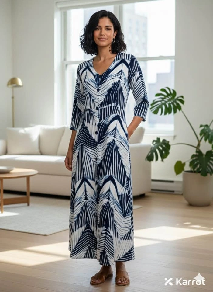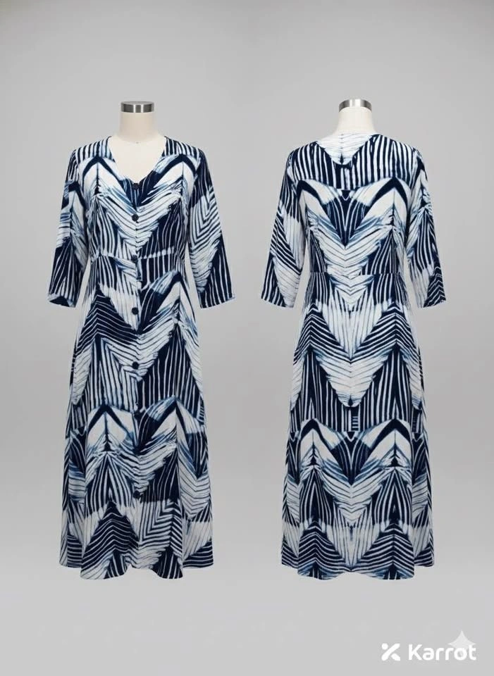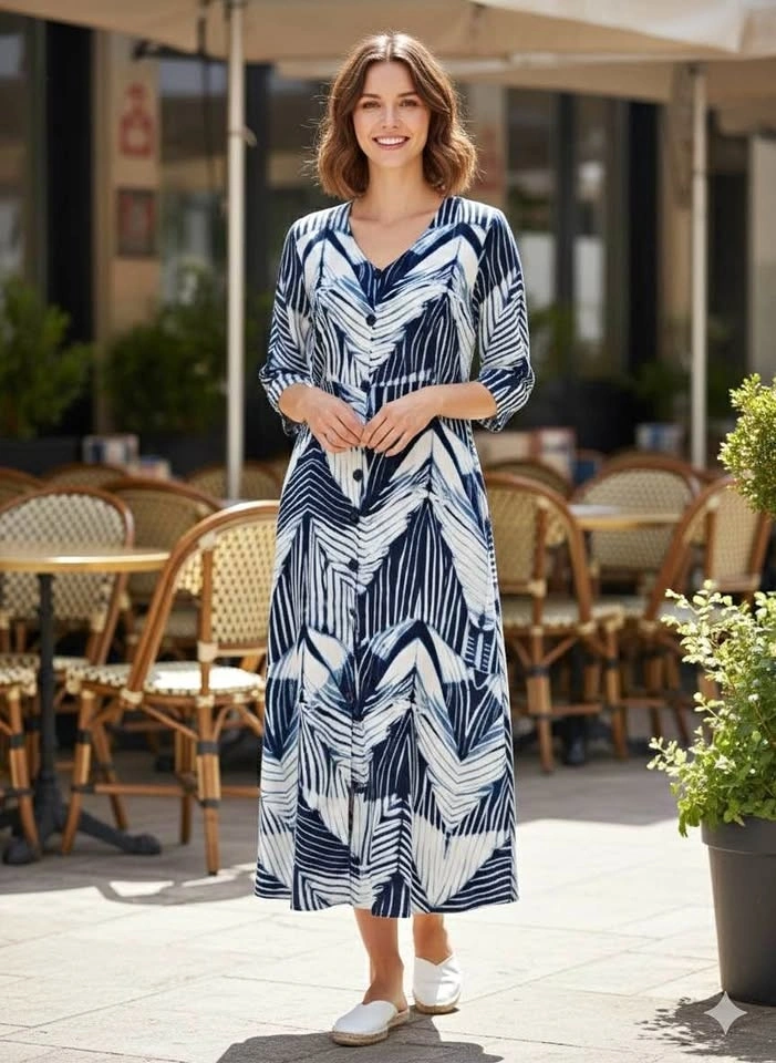 Elevate your everyday style with this striking indigo and white midi dress. Featuring a unique, hand-painted style abstract chevron pattern, this dress offers a perfect blend of artistic flair and modern sophistication. Design: Elegant V-neckline with a classic button-down front. Size: L/XL.