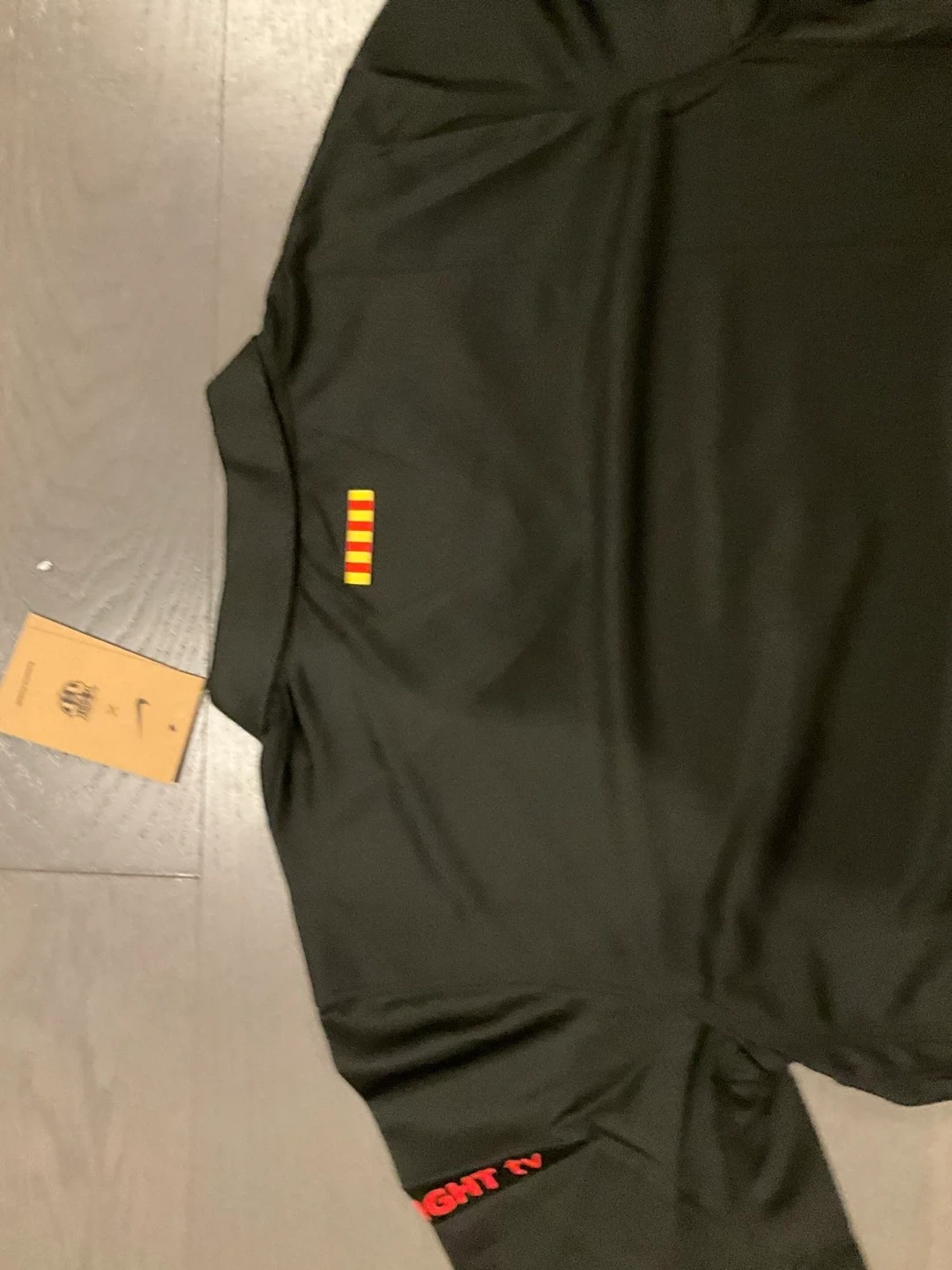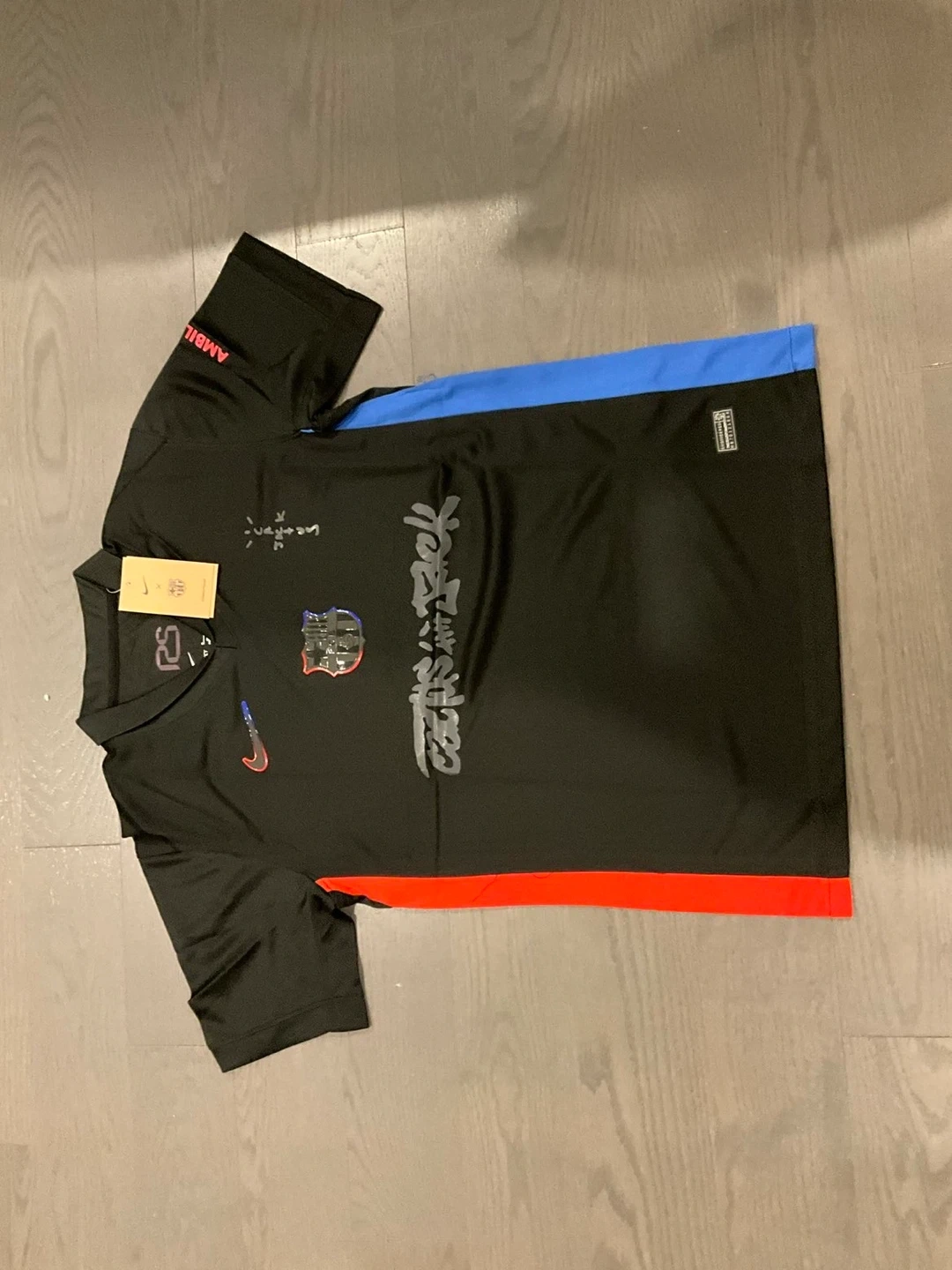 Selling a Nike x Travis Scott x FC Barcelona jersey. It's black with red and blue accents. Features the UNHCR ACNUR logo on the back.