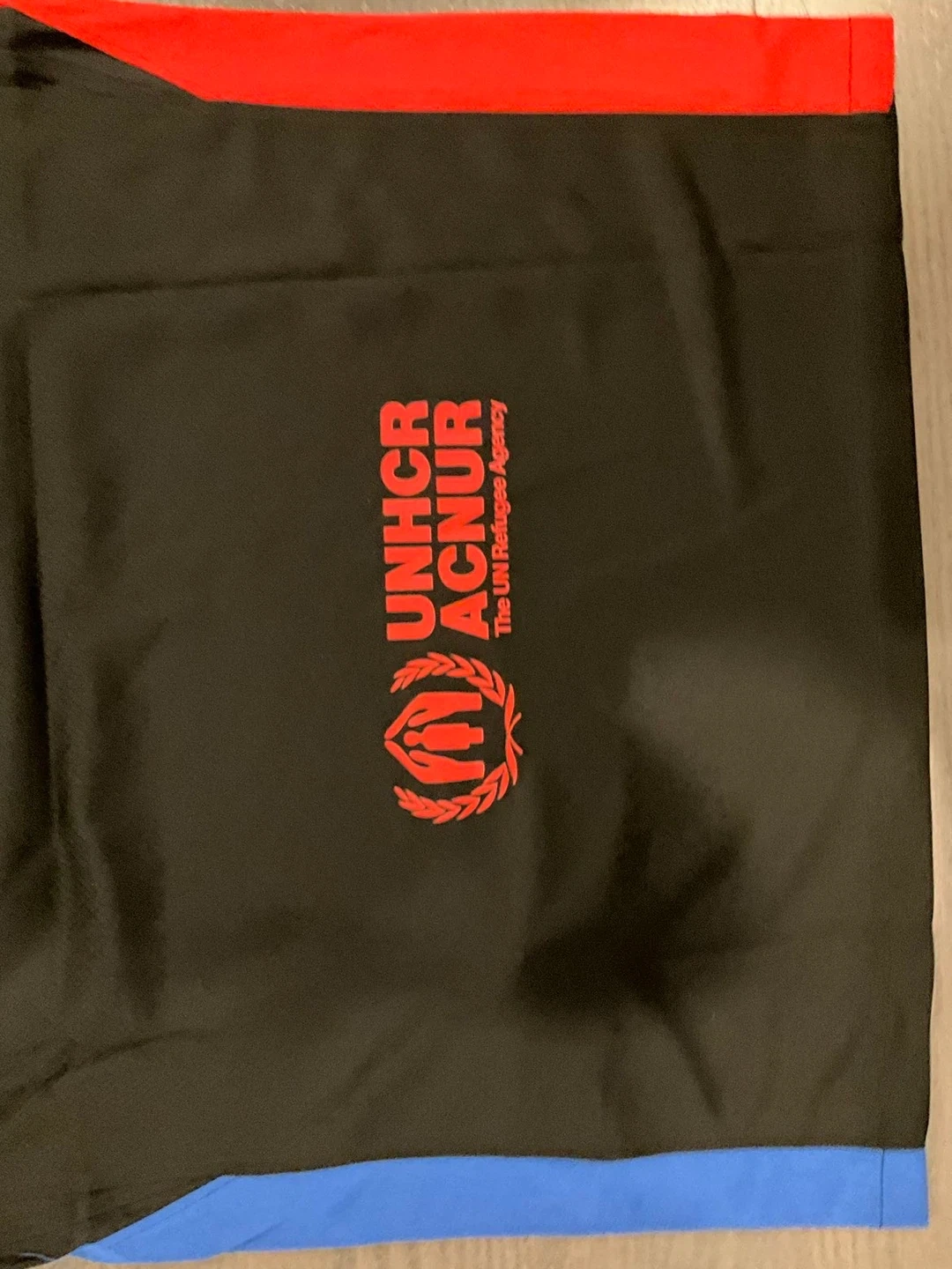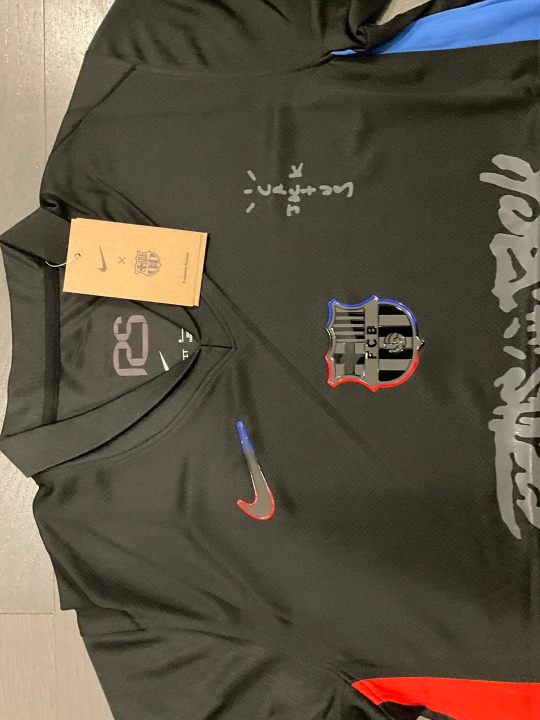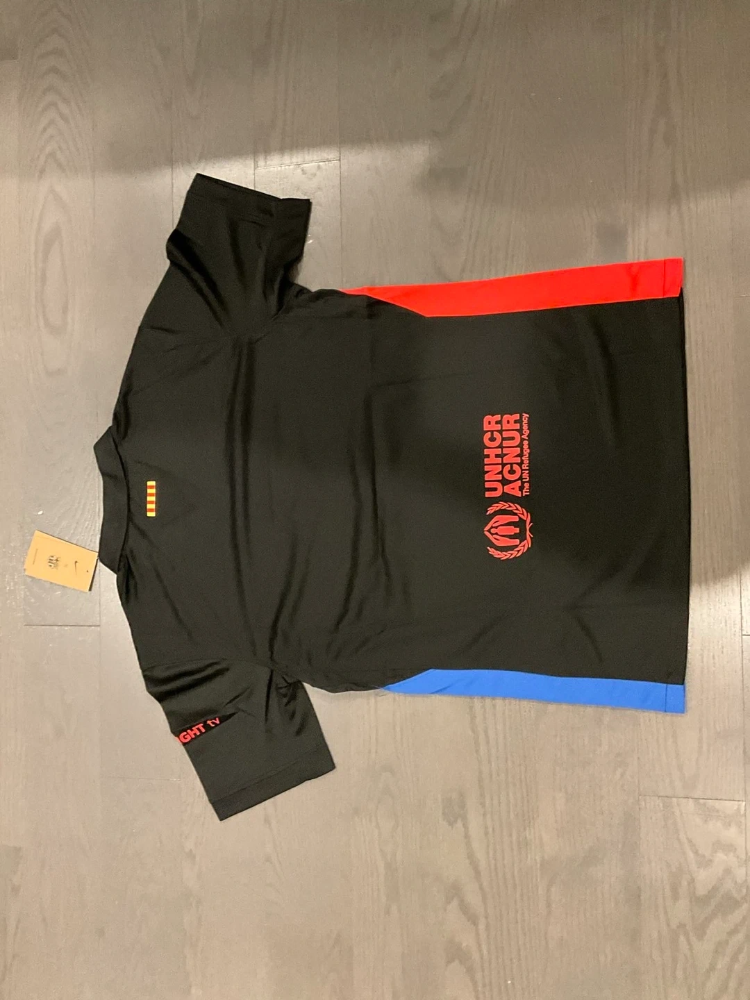 Selling a Nike x Travis Scott x FC Barcelona jersey. It's black with red and blue accents. Features the UNHCR ACNUR logo on the back.