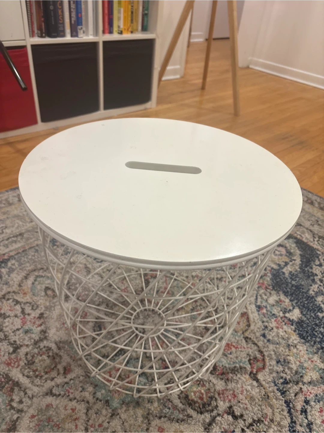 White wire storage basket with a top that can be used as a side table piece for stashing blankets or magazines. Useful for small spaces!