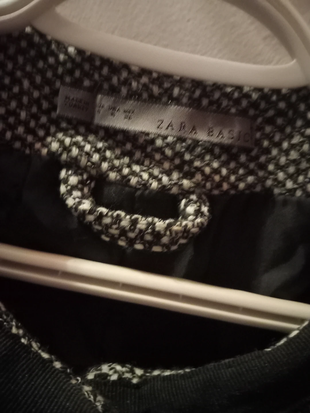 This is a stylish Zara Basic women's blazer. It's a textured with a black trim and button-front closure. Material blend for comfort and structure.