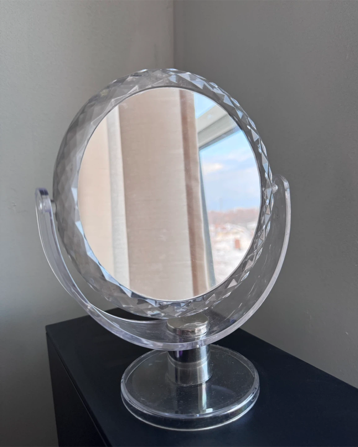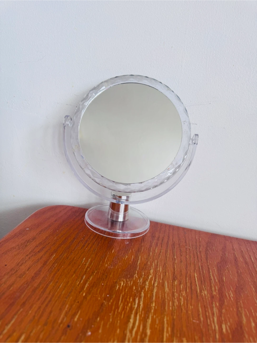 Selling a clear mirror and magnifying with a clear plastic frame. It has a rotating head and a stable clear plastic base. It's perfect for any dressing table or makeup station!