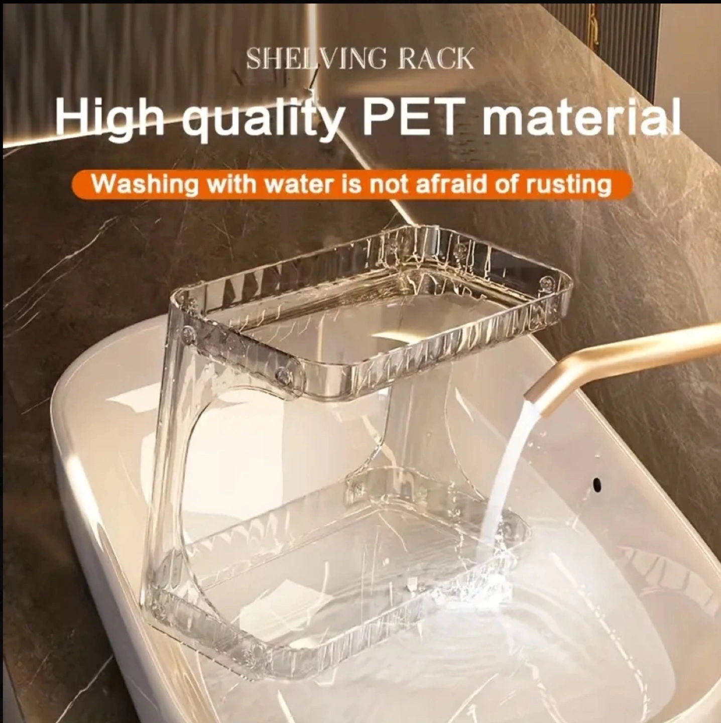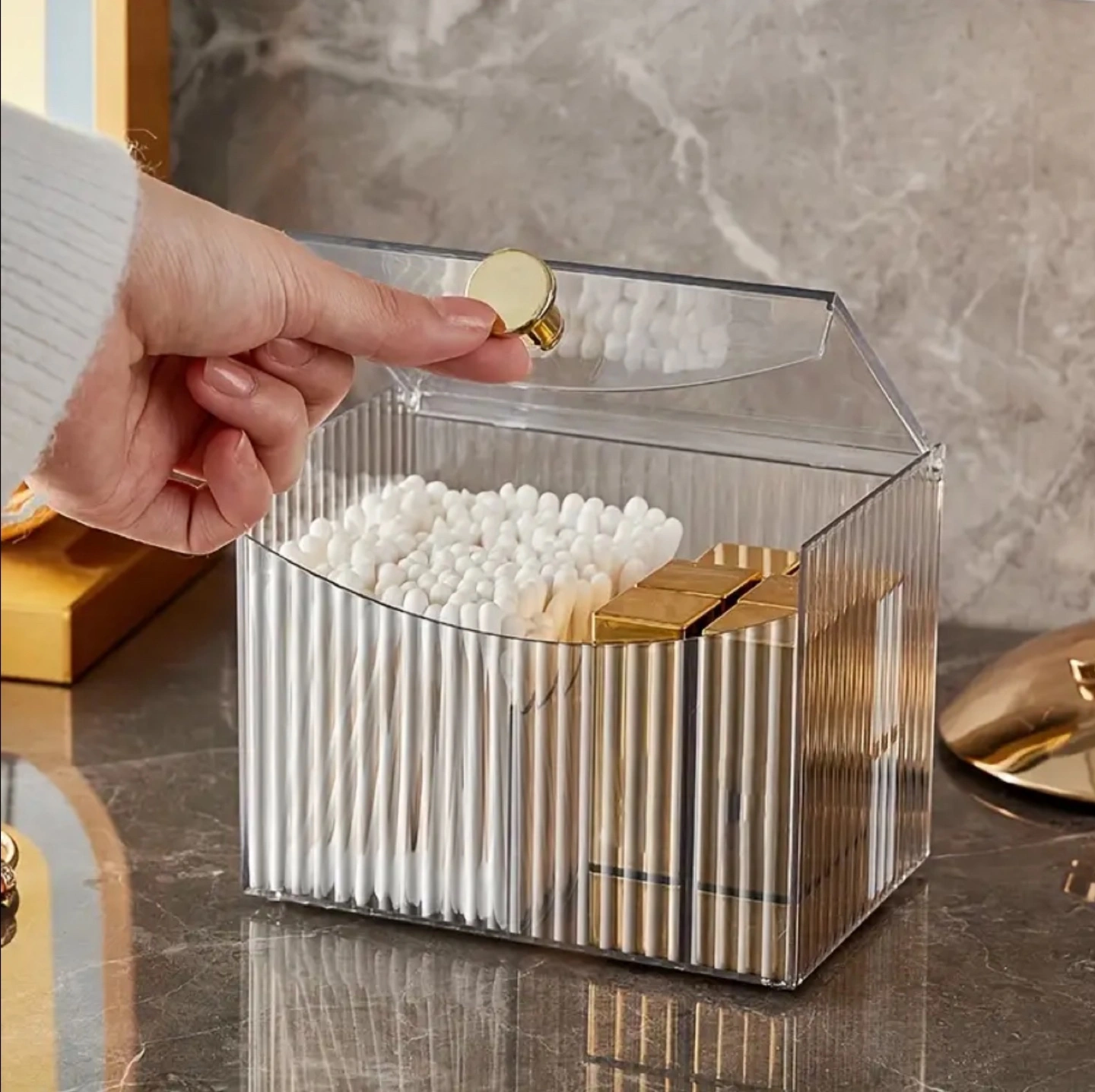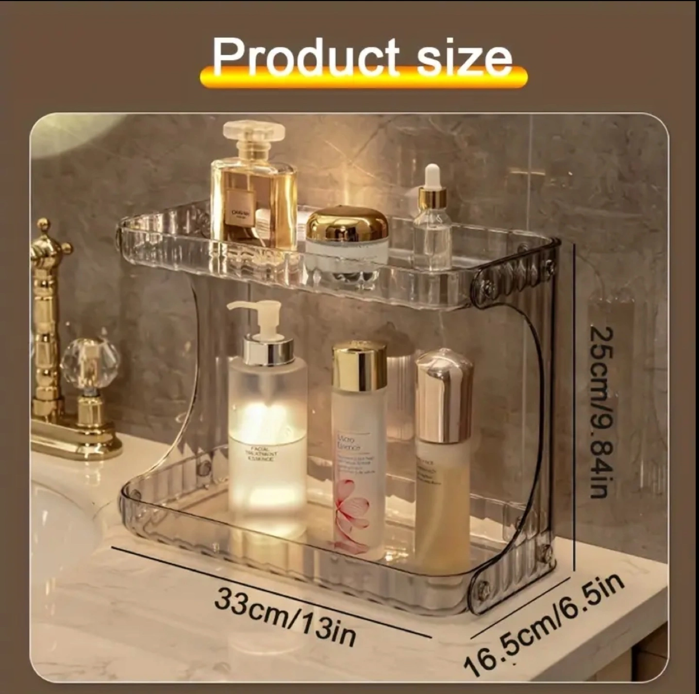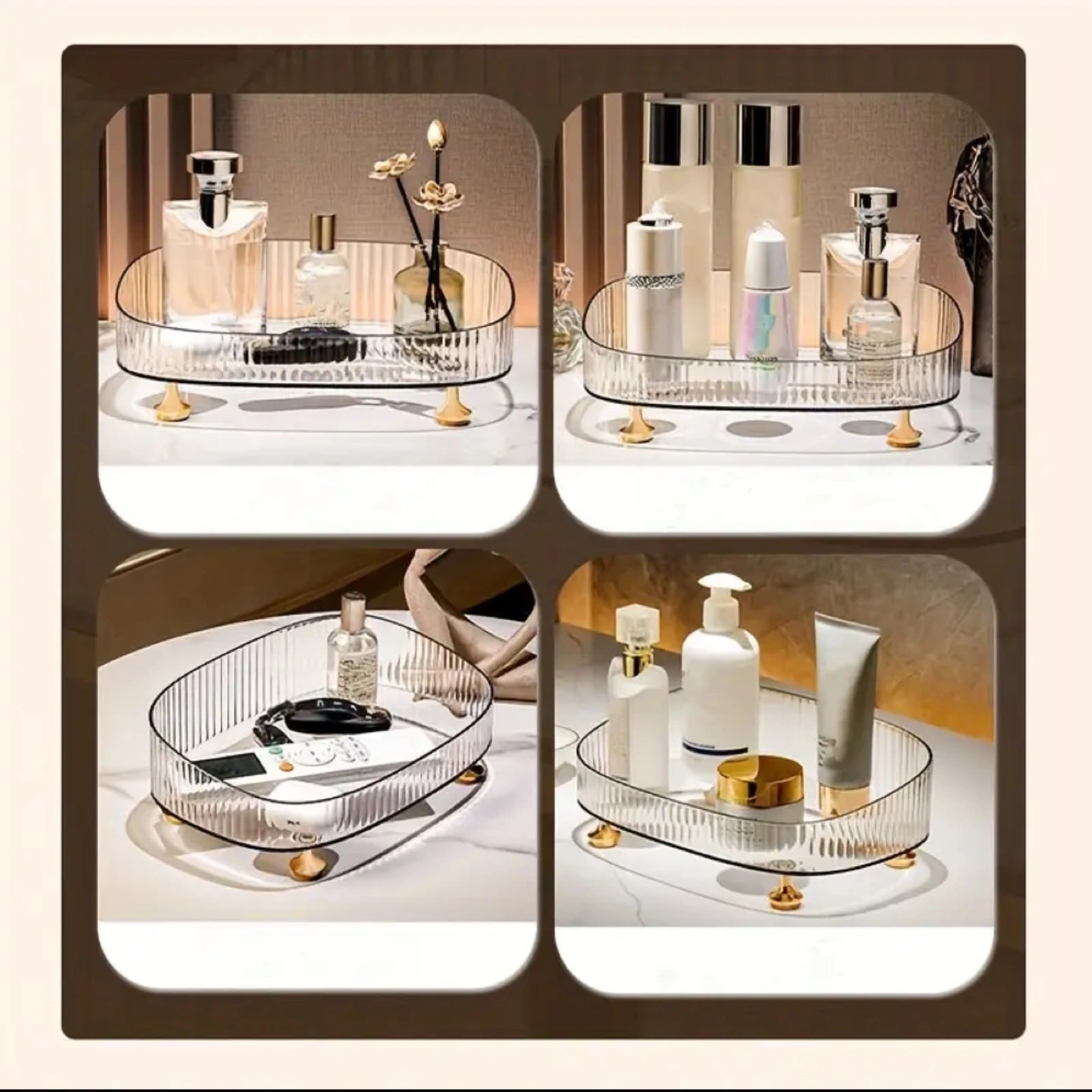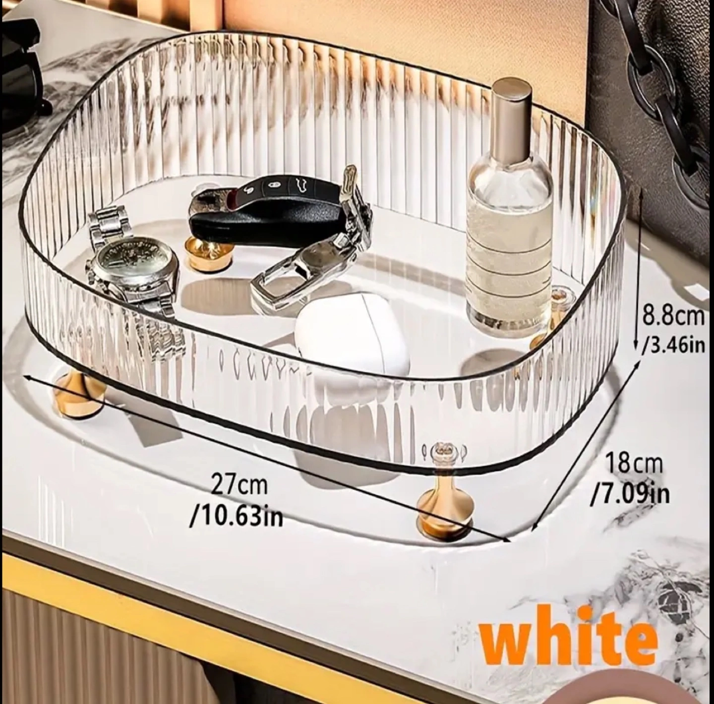 Stylish and functional organizer. Perfect for bathroom or vanity. Features gold coloured feet. Multiple sizes available. Made of PET plastic. Water resistant.