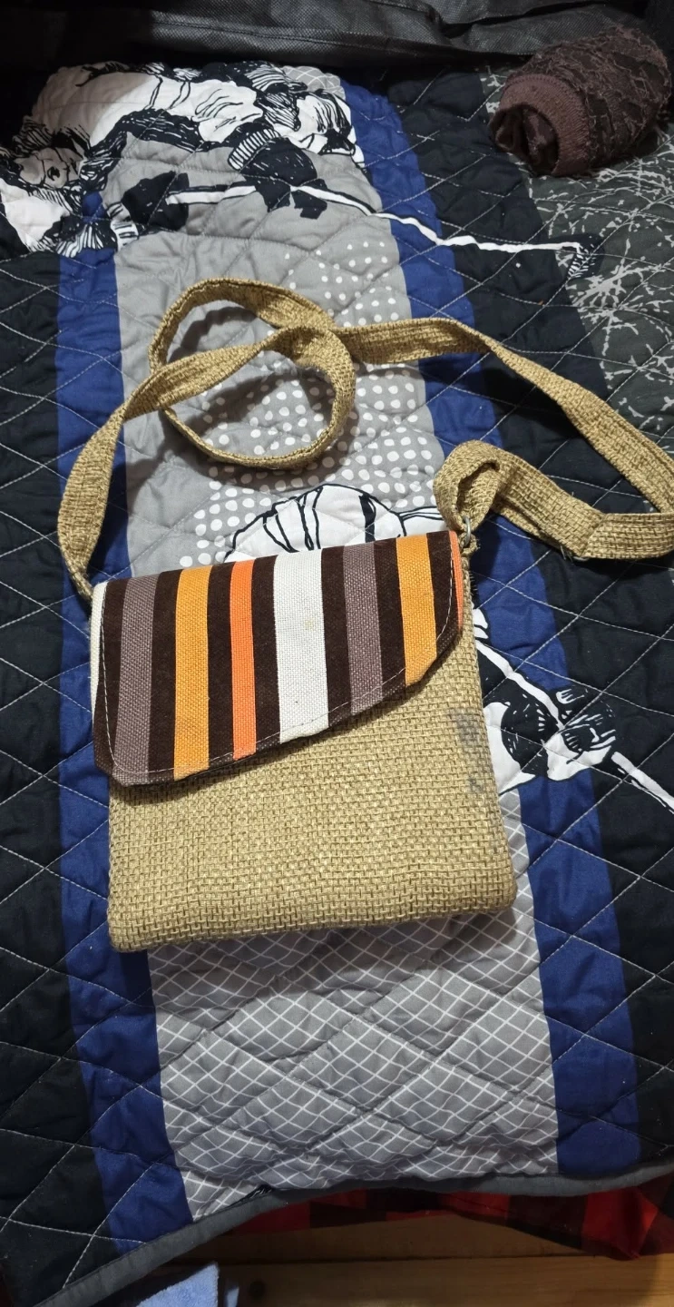 This charming crossbody bag is made from a durable woven material. It features a colourful flap with stripes in brown, orange, and white. The strap is adjustable for a comfortable fit.