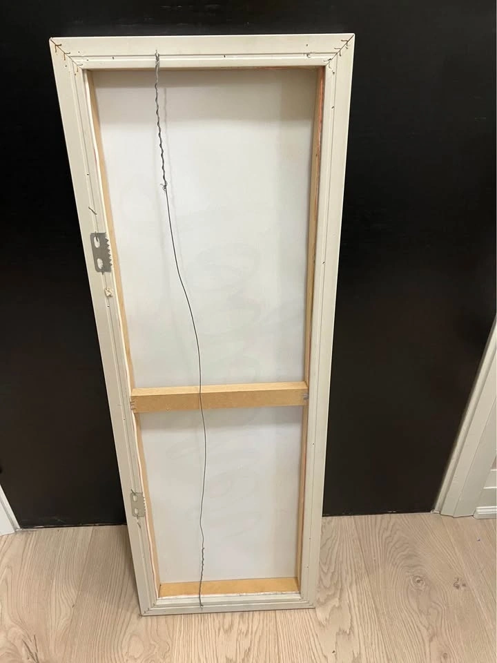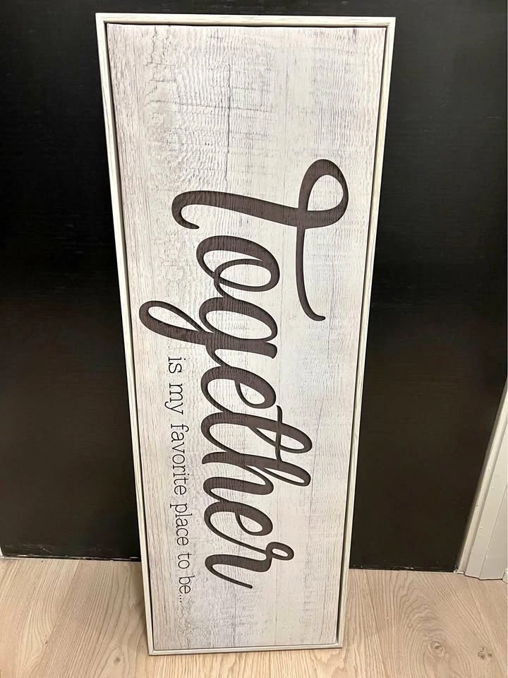 Canvas wall art with a wood look. "Together is my favourite place to be" phrase. Measures 13x27”. There is slight water damage on the frame. Pick up asap.