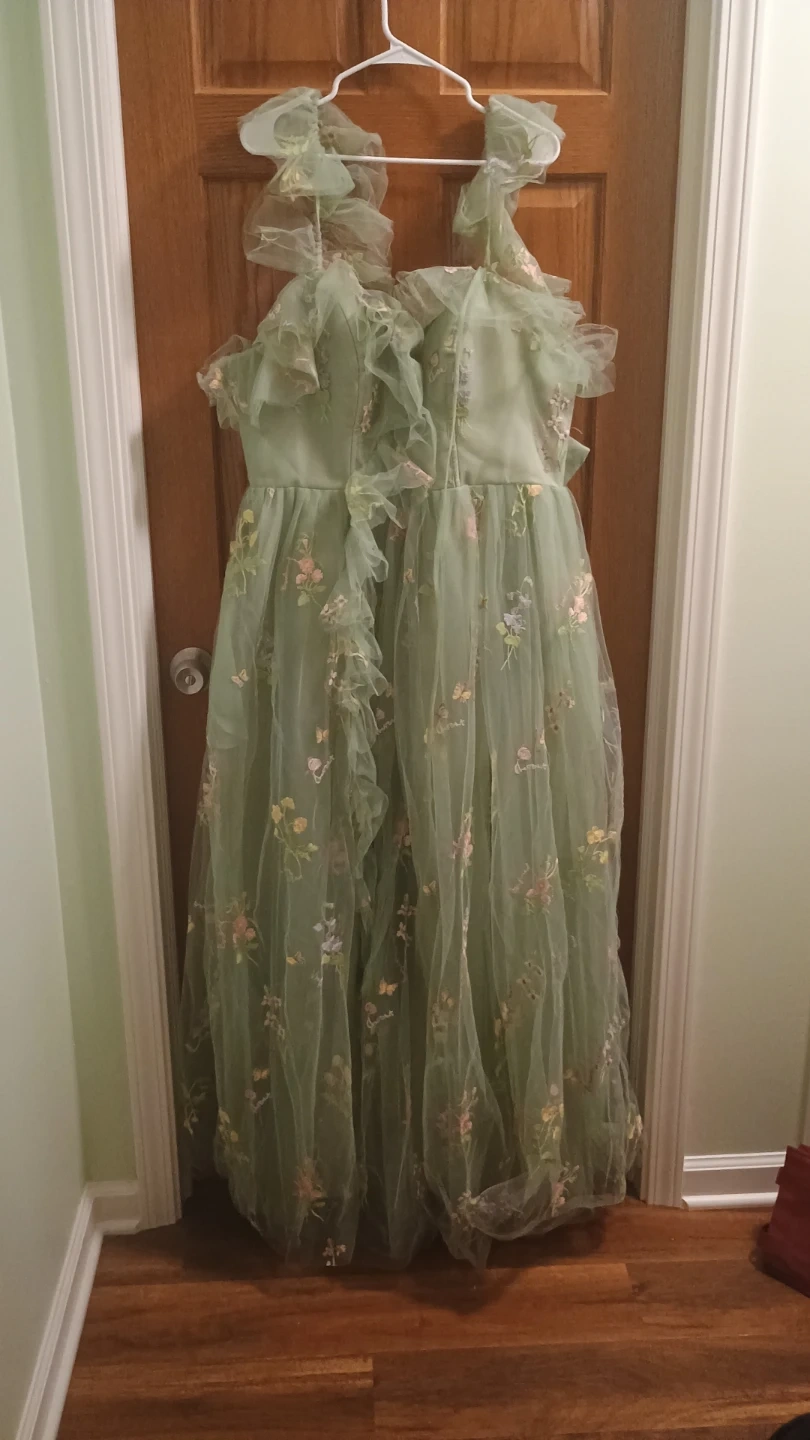 Beautiful green tulle dress with floral embroidery. It's in great condition and ready for a new home. The dress features delicate ruffles and a flowing skirt, perfect for a special occasion or just to feel like a princess. Feel free to reach out with any questions!