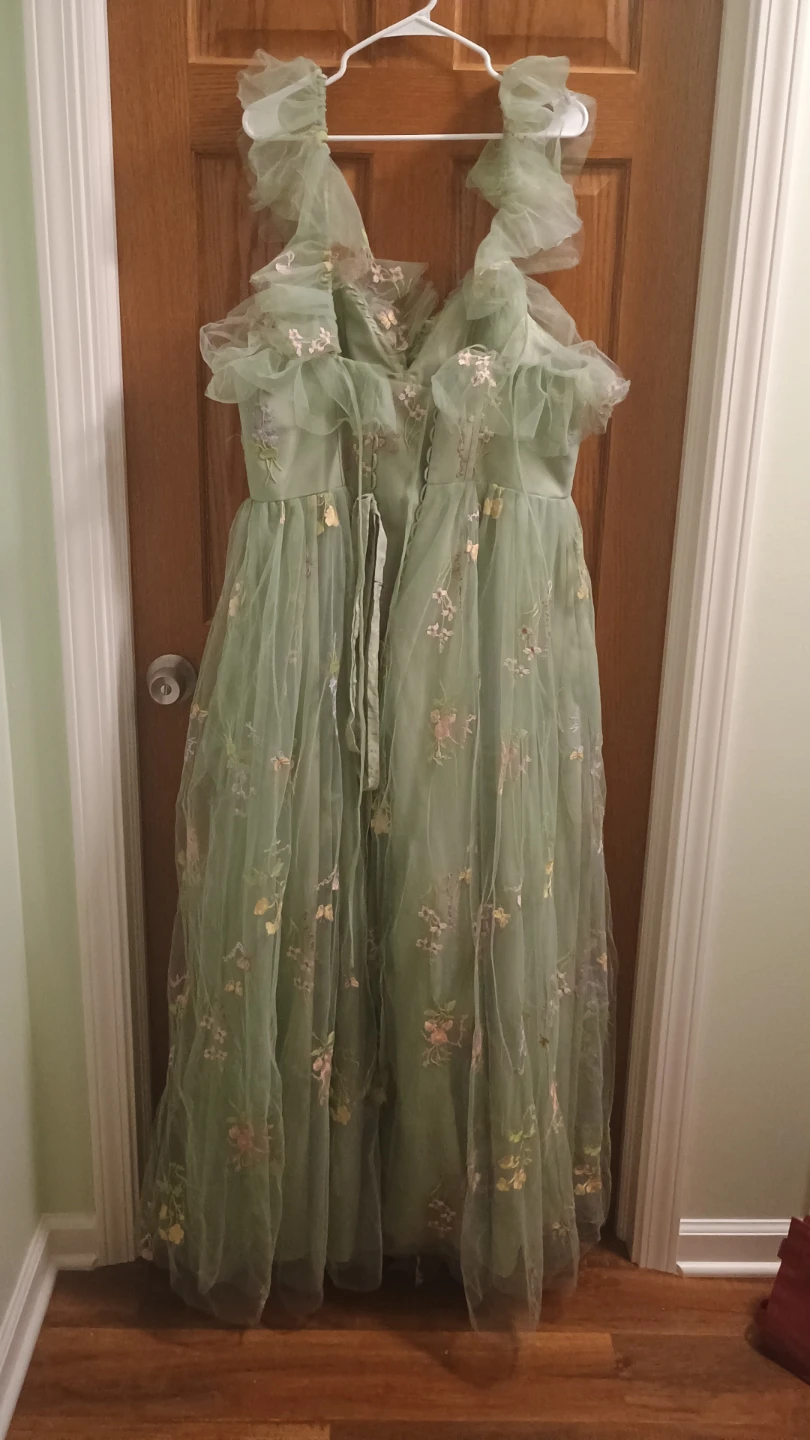 Beautiful green tulle dress with floral embroidery. It's in great condition and ready for a new home. The dress features delicate ruffles and a flowing skirt, perfect for a special occasion or just to feel like a princess. Feel free to reach out with any questions!