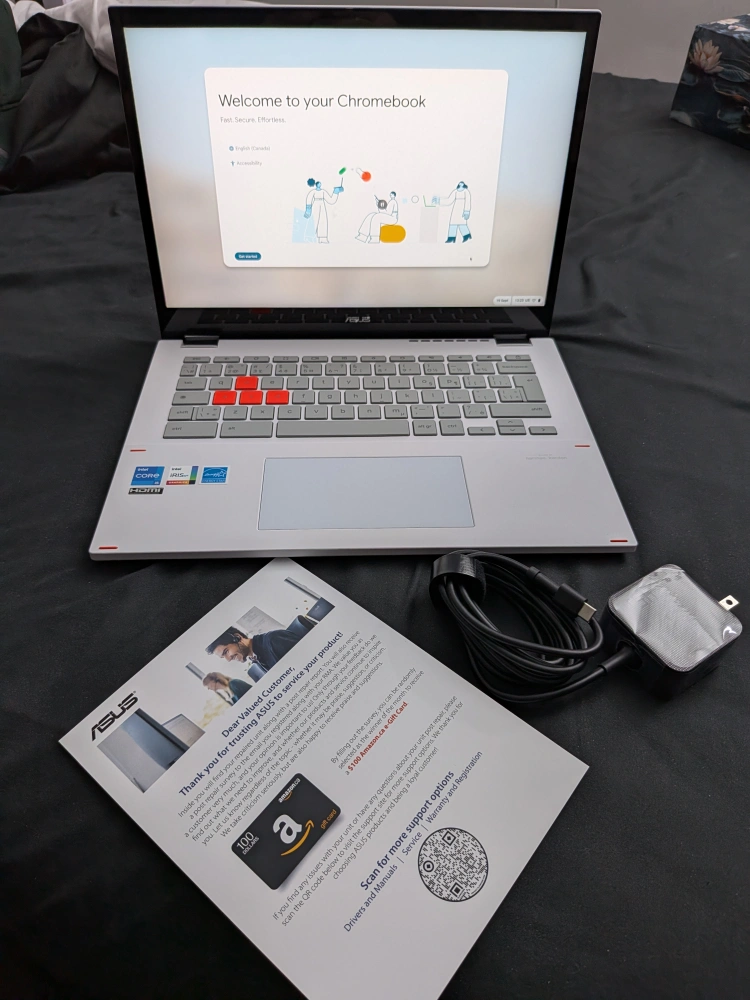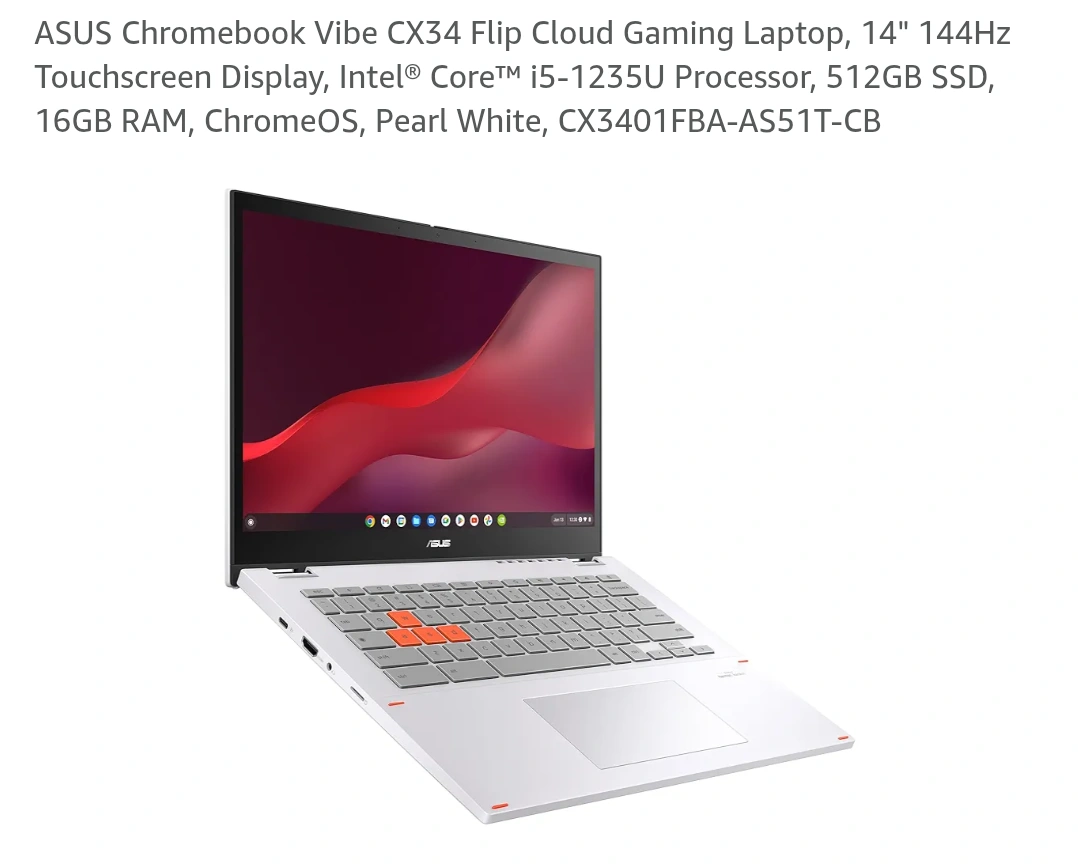 Selling an ASUS Chromebook Vibe CX34 Flip in excellent condition! This laptop features a 14" 144Hz touchscreen display, an Intel Core i5-1235U processor, 512GB SSD, and 16GB RAM. It runs on ChromeOS and comes in a stylish Pearl White colour. Includes the original box and charger!