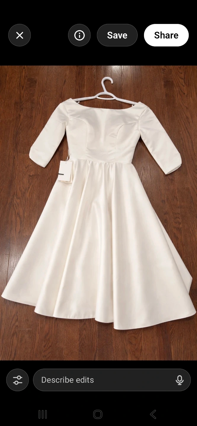 This elegant white satin dress features a flattering A-line silhouette and three-quarter sleeves. It's perfect for special occasions and has a timeless style.