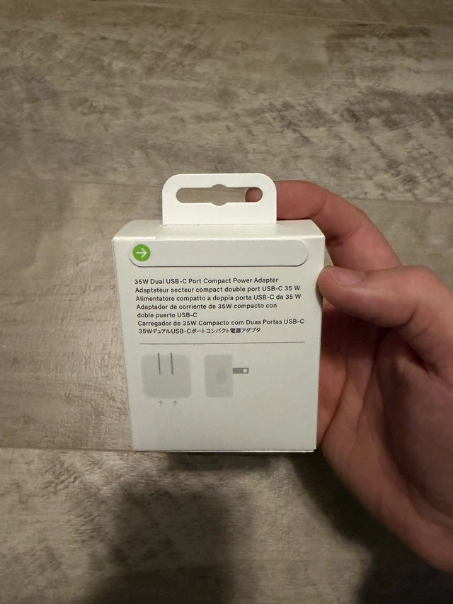 Factory-sealed Apple dual USB-C power adapter. Charge two devices at the same time. Compact and travel-friendly. Genuine Apple product, 35W total output, dual USB-C ports. Unopened. Asking $40. Located in Nanaimo.