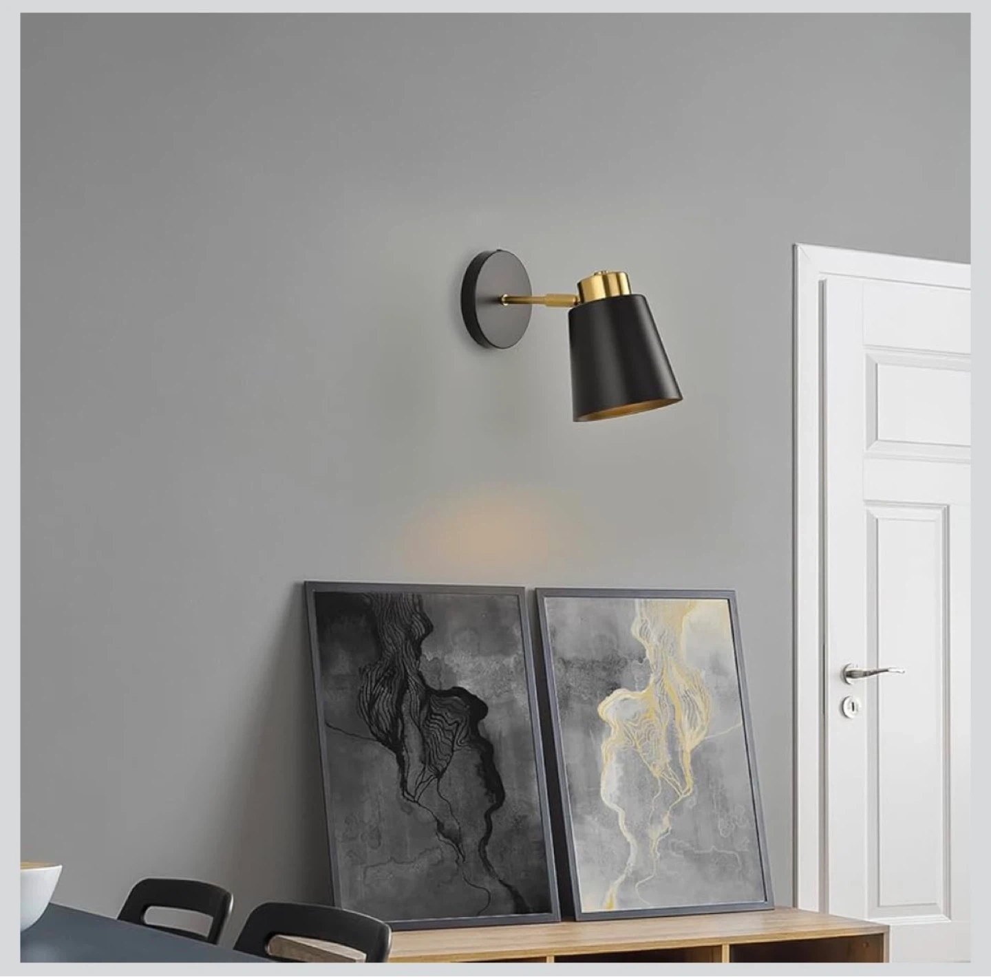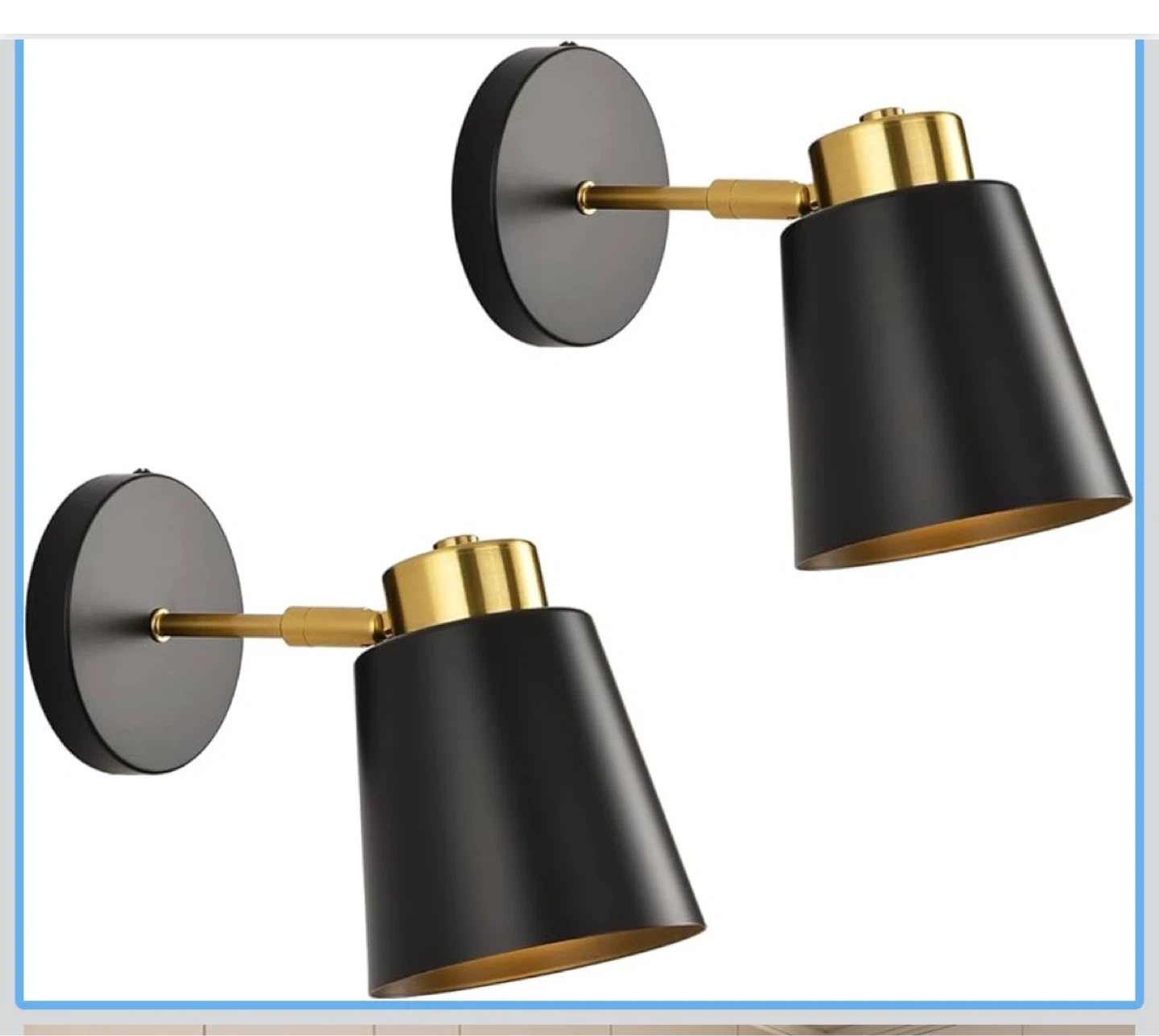 This modern wall sconce features a black conical shade with a gold interior and brass hardware. It's designed with an E26 ceramic lamp holder and offers 350° swing adjustability. It's great for adding accent lighting in bedrooms or hallways!