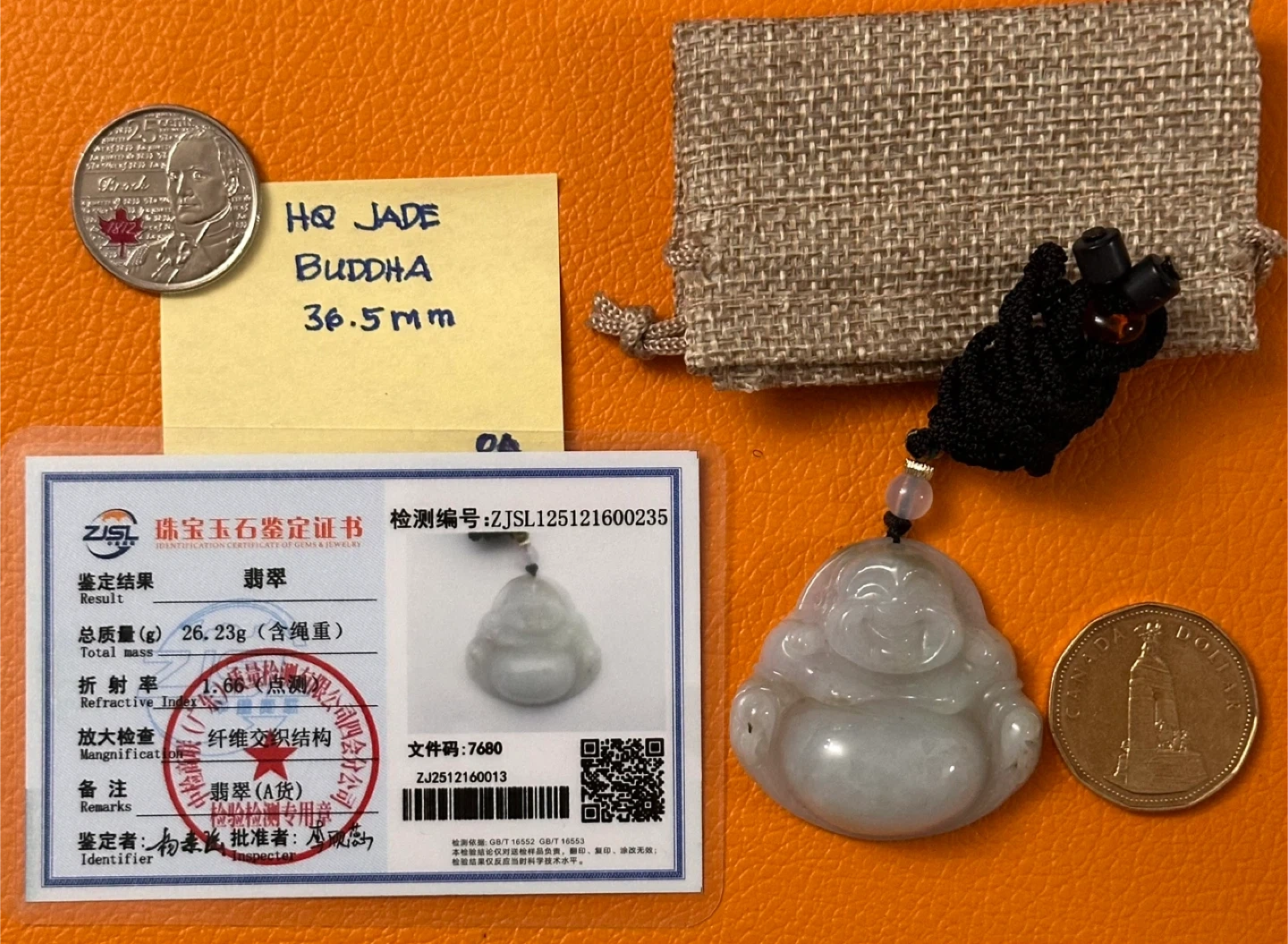 This is a carved rare high quality jade pendant featuring a Laughing Buddha. It measures 36.5mm and has a total mass of 26.23g. Comes with a certificate of analysis and a protective pouch.