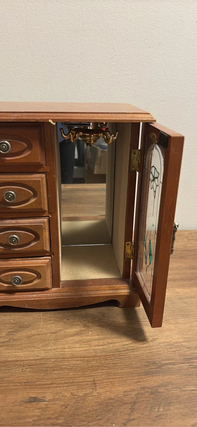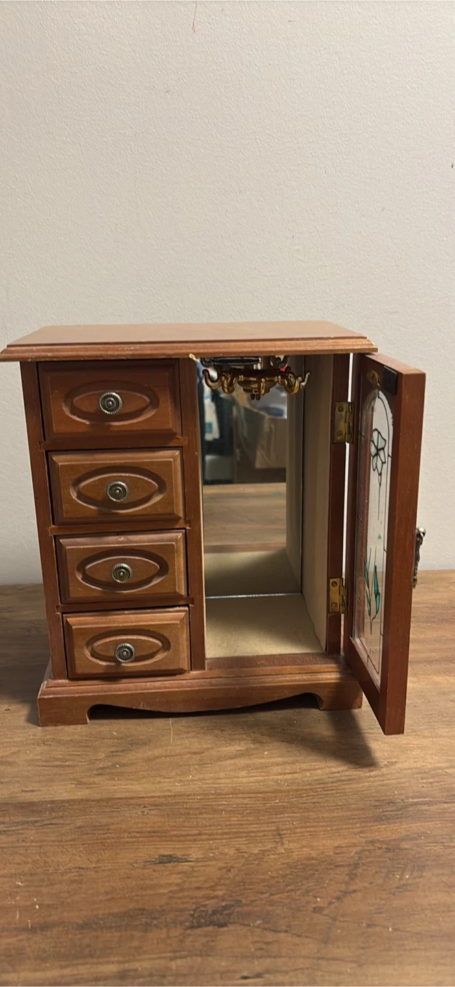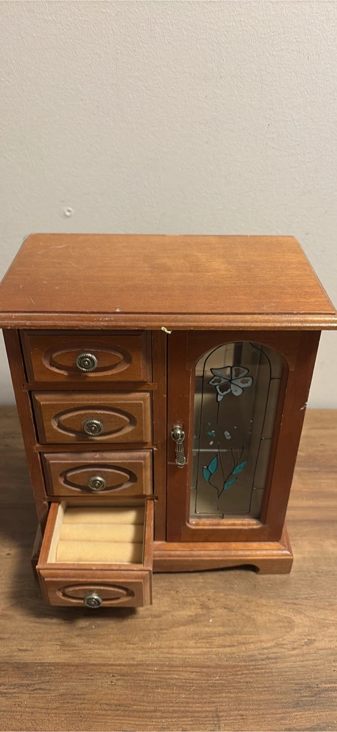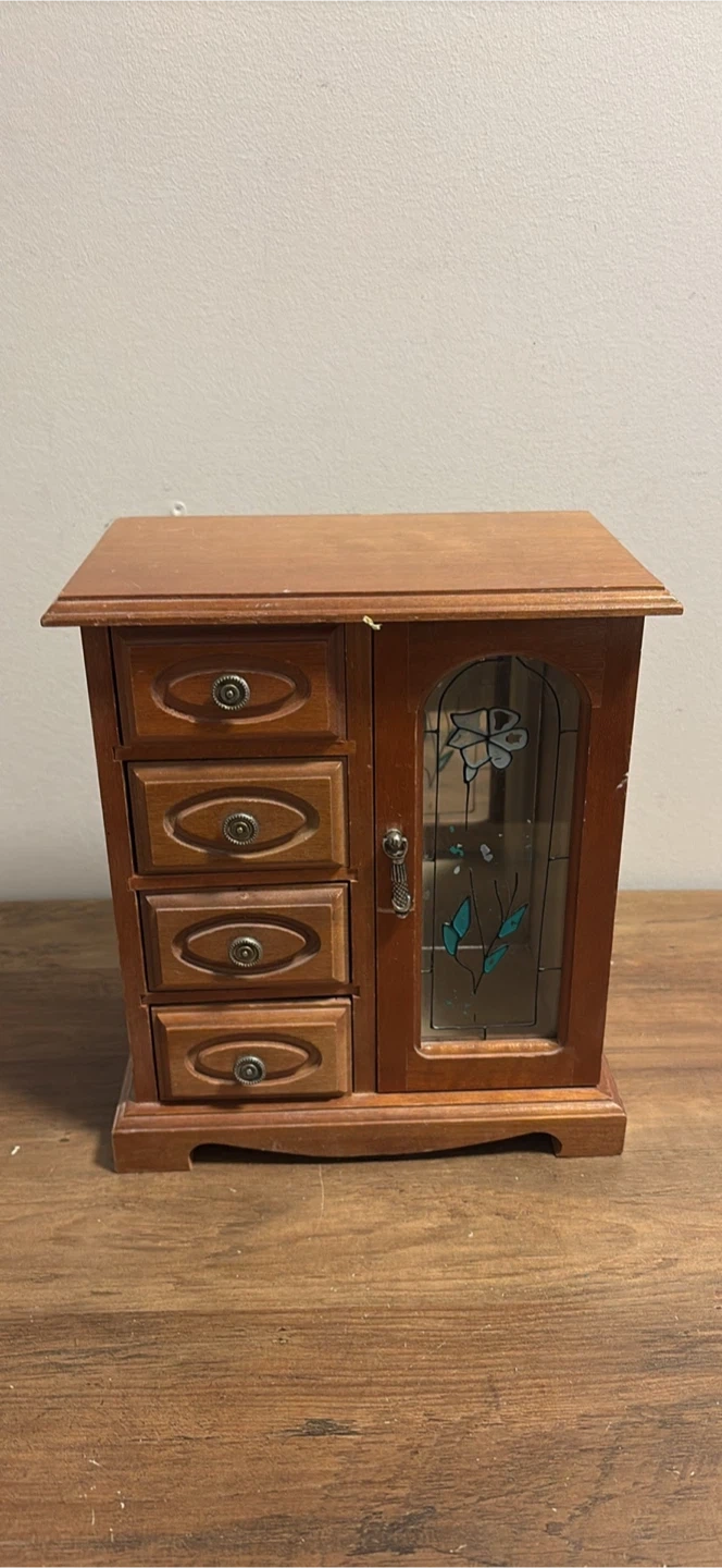 This wooden jewelry box features four pull-out drawers for storage. It also has a single door with a decorative stained glass panel and hooks inside. The interior is lined with a soft fabric. It's a lovely piece for organizing your accessories!