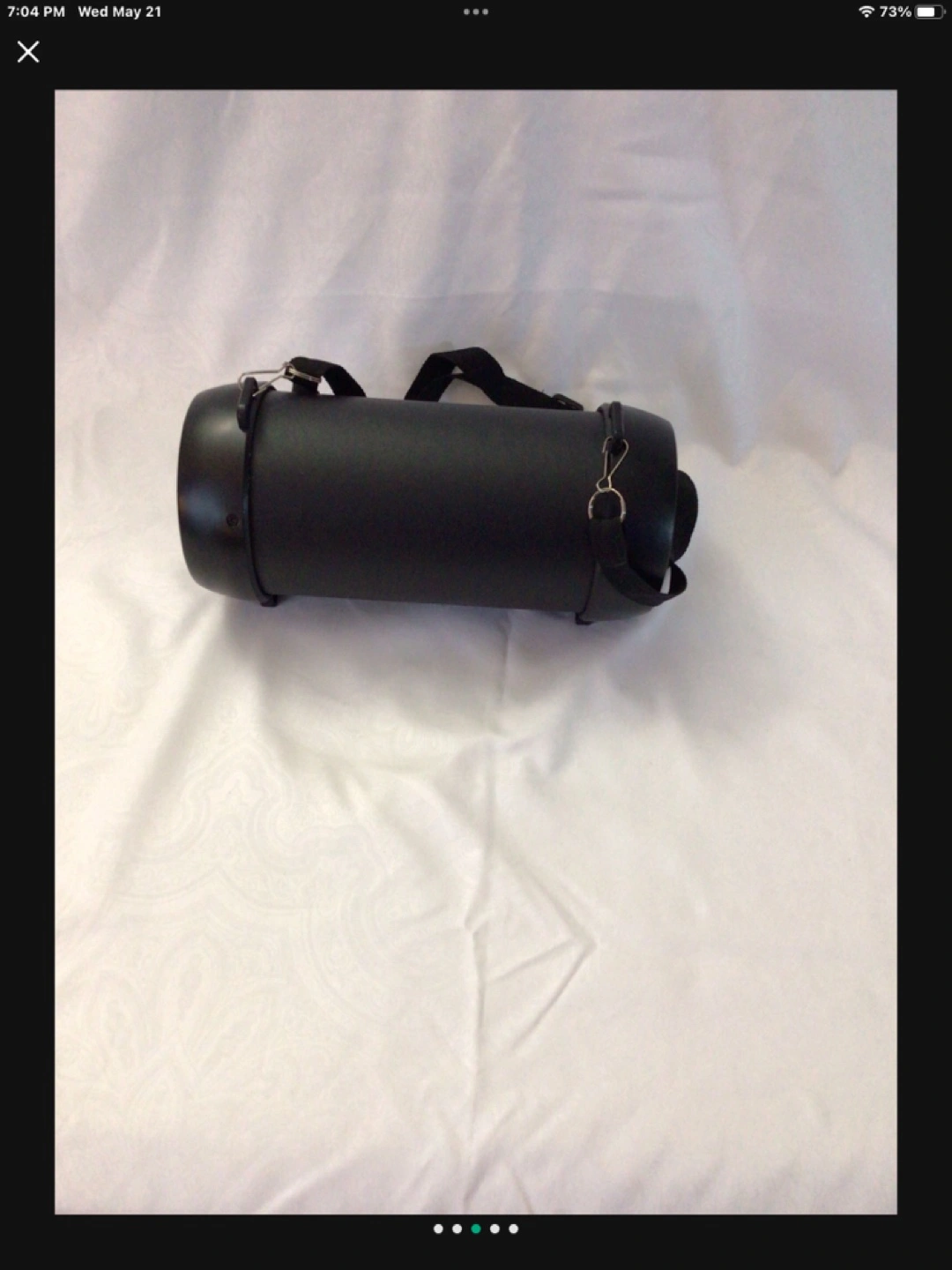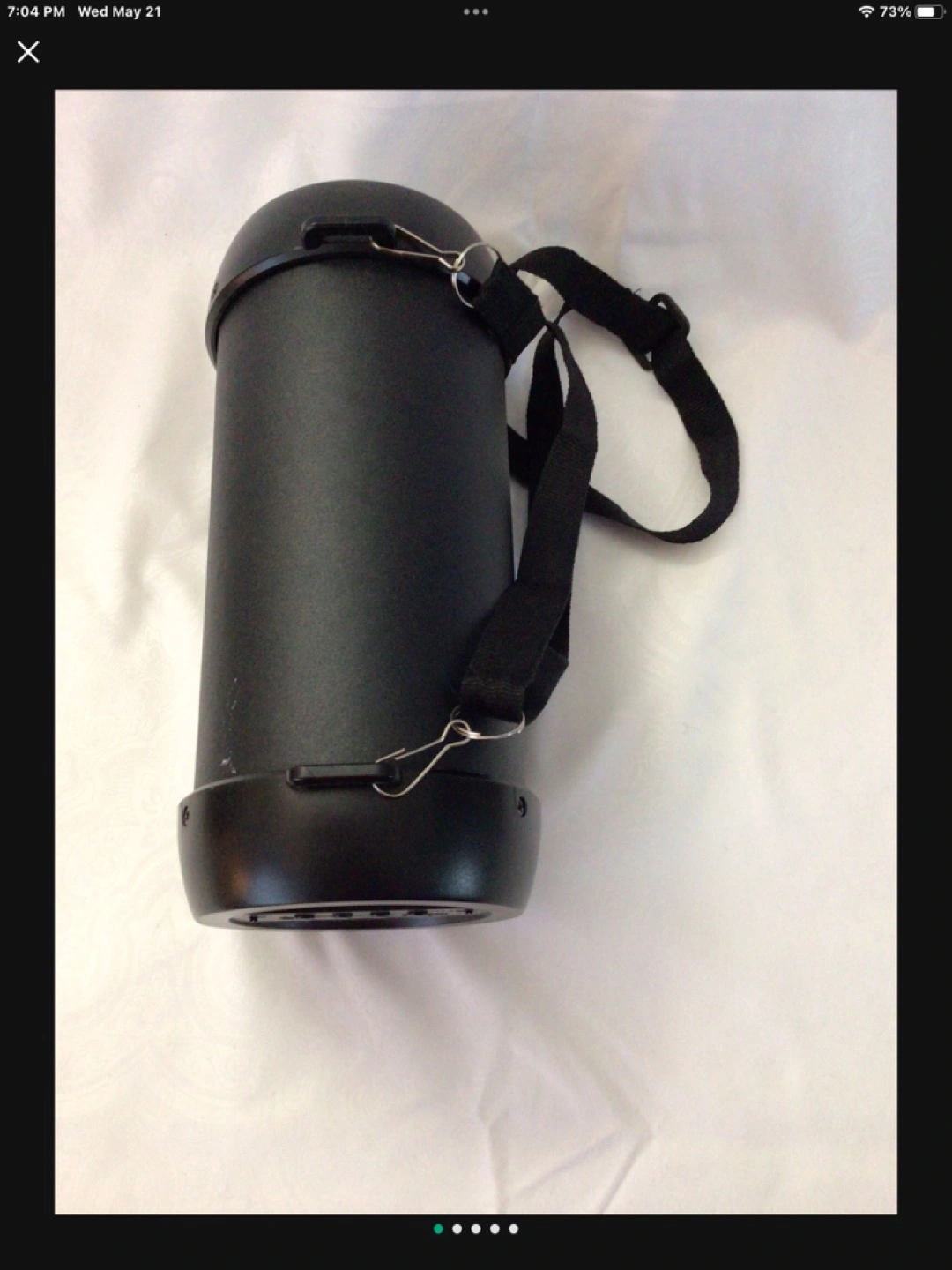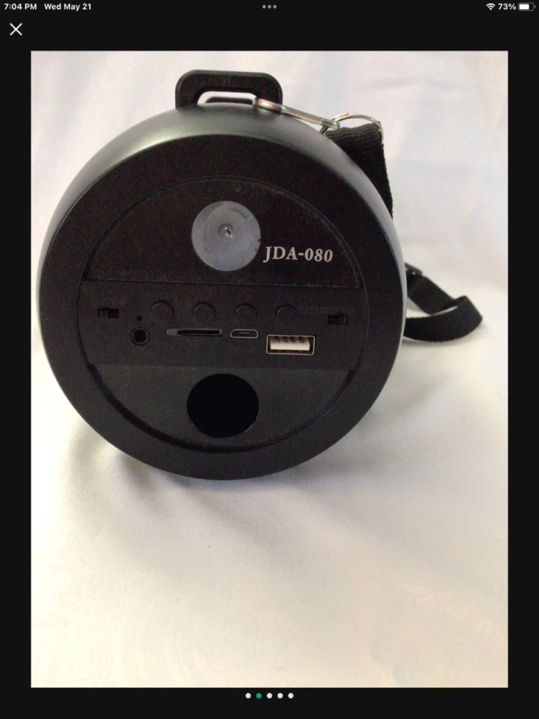 Black portable Bluetooth speaker. Includes shoulder strap. Features multiple ports including USB, SD card, and aux. Great for travel.