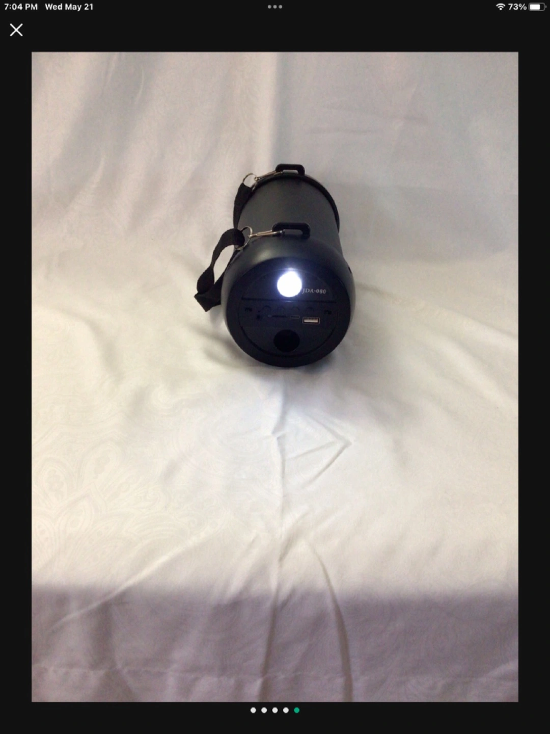 Black portable Bluetooth speaker. Includes shoulder strap. Features multiple ports including USB, SD card, and aux. Great for travel.