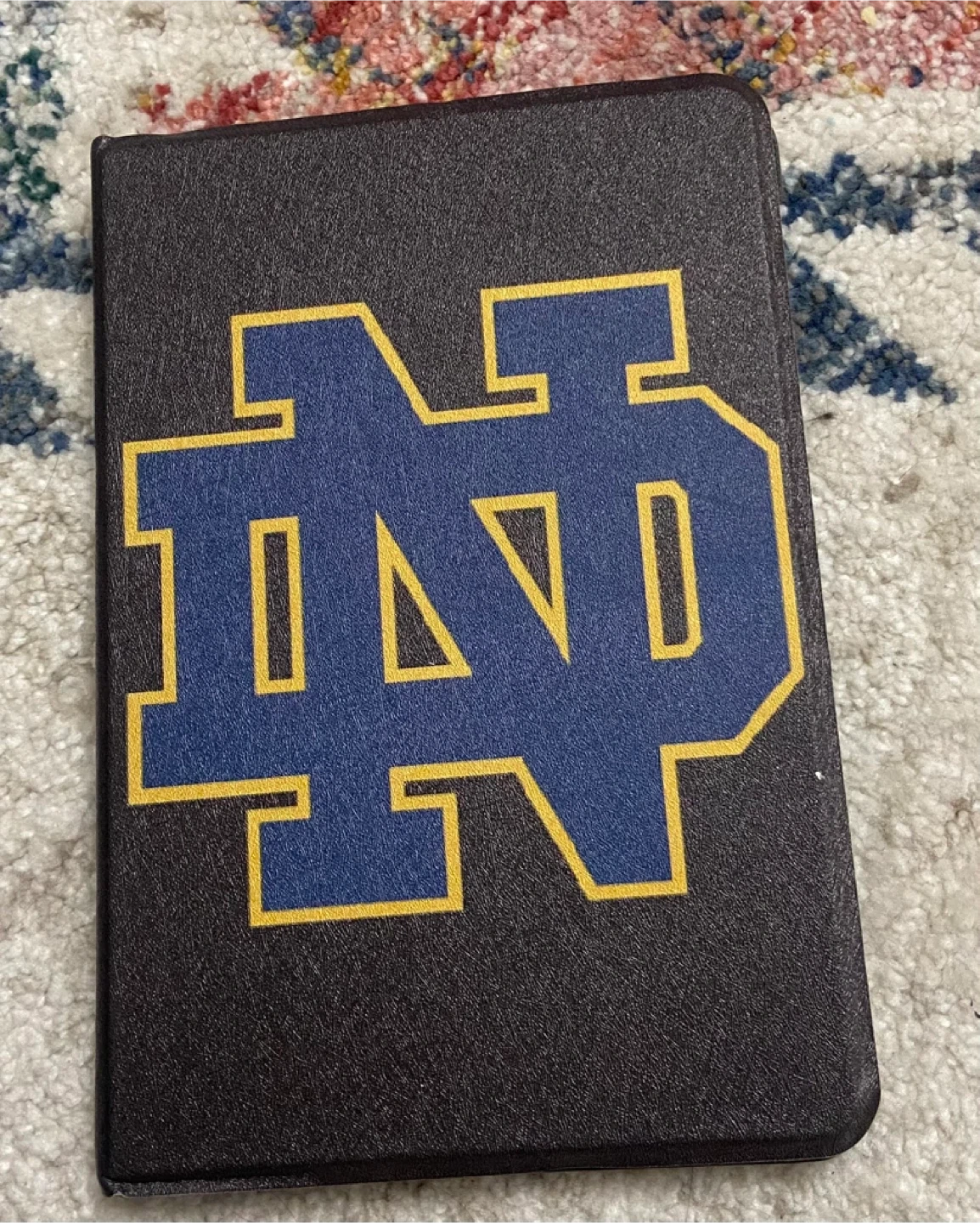 This black tablet case features the Notre Dame Fighting Irish logo in navy blue and gold. It's a folio-style cover designed to protect your device. The interior has a slot for your tablet on one side and a textured grip on the other. This case is great for any Notre Dame fan!