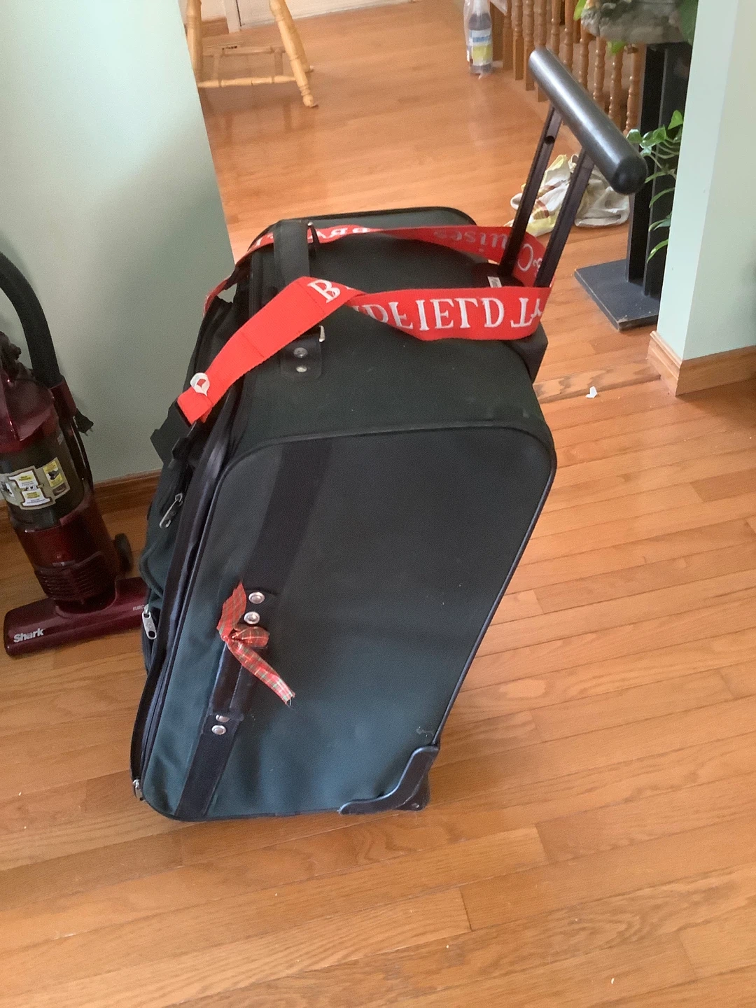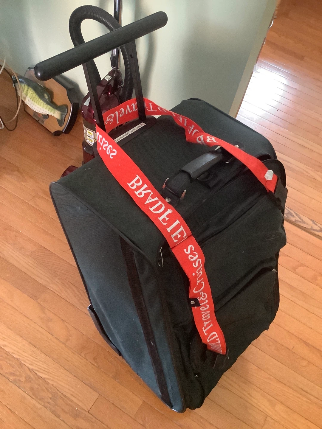 Black Rolling Suitcase with Red "WORLD TRAVEL & CRUISES" Strap