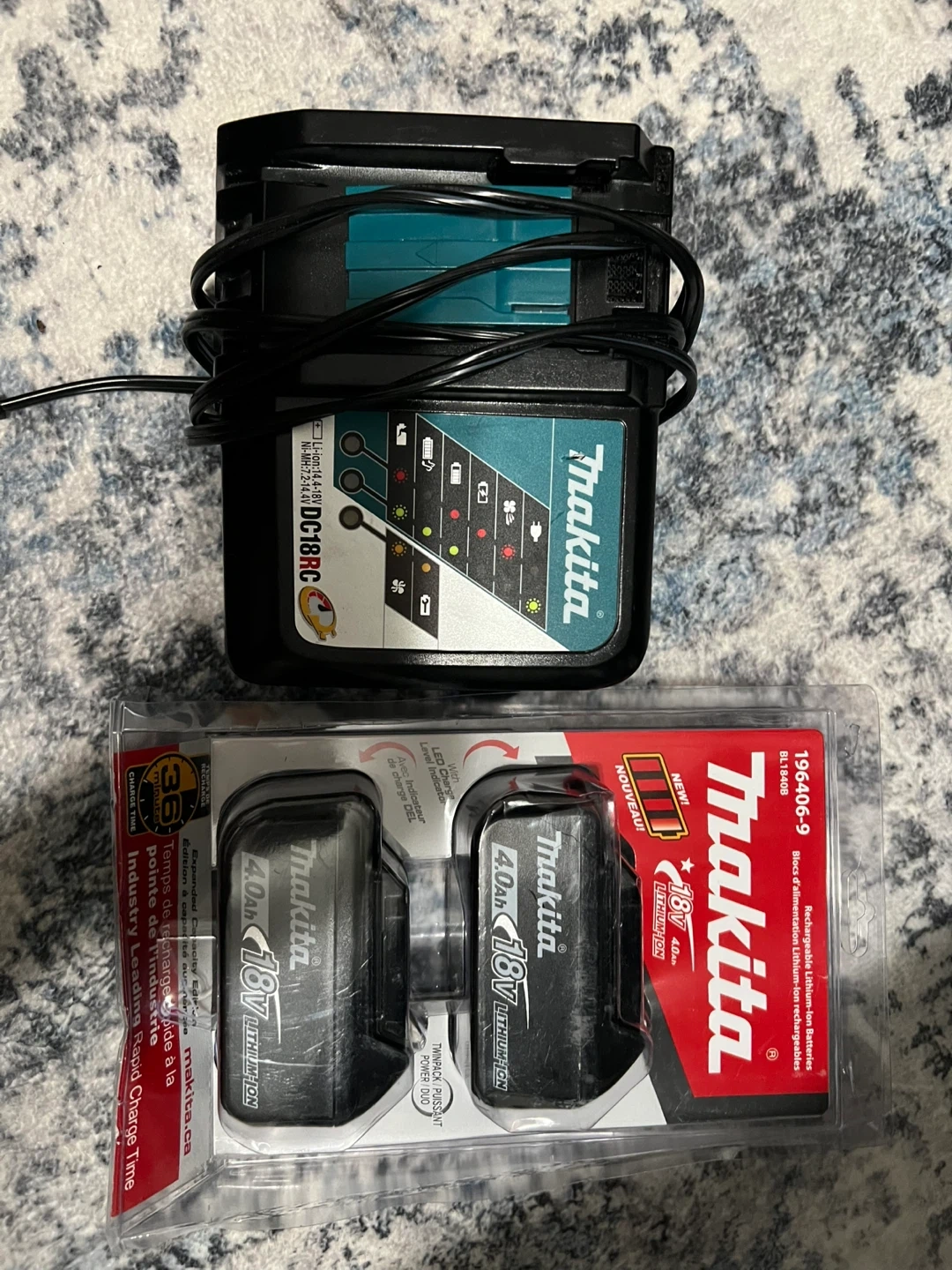 Selling a Makita 18V 4.0Ah Lithium-Ion battery and charger set. The battery is 4.0Ah and 18V. It is a rechargeable lithium-ion battery. The charger has an LED charge level indicator. The set includes a DC18RC charger.