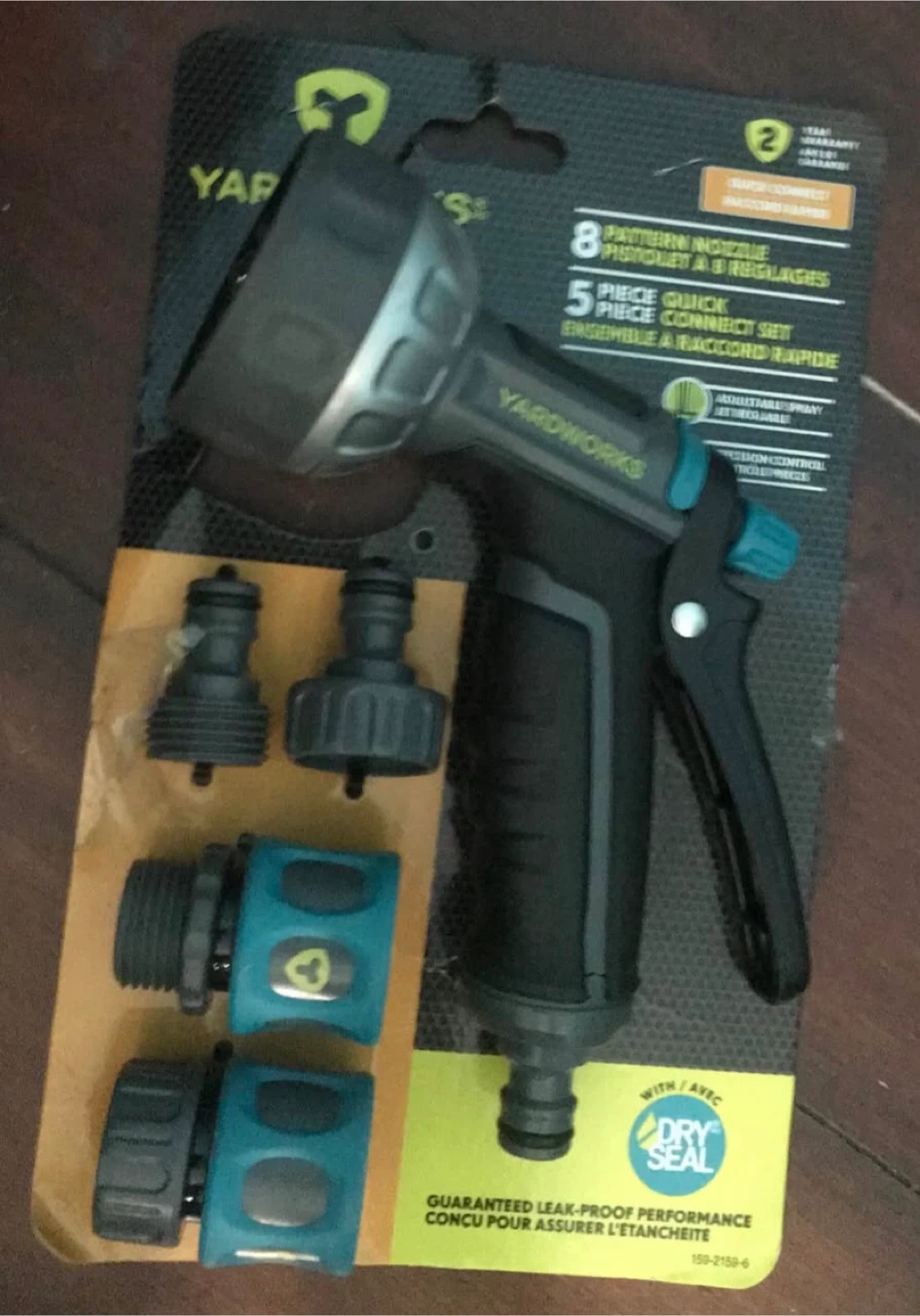 This Yardworks garden hose nozzle features 8 spray patterns and comes with a 5-piece quick connect set. It's designed for guaranteed leak-proof performance. This set includes the nozzle and multiple connector pieces for your garden hose.