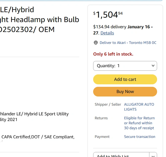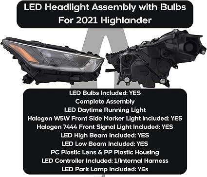 Headlight assembly compatible with 2021-2023 Toyota Highlander L/ LE/ Hybrid LE/ XLE / Hybrid XLE Sport Utility LED Headlight Assembly with Bulb and DRL Left / Driver Side Partslink TO2502302/ OEM 81150-0E420 Durable Alligator Auto Headlight is made of high quality materials which is excellent durability, not easy to deformation and fracture.