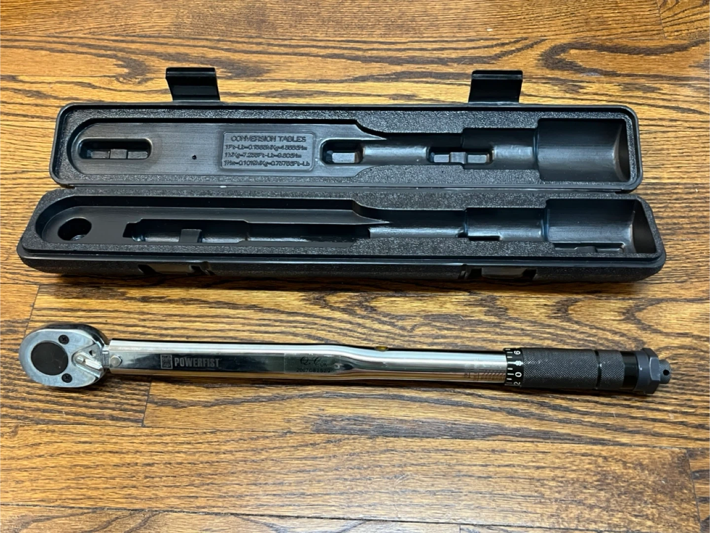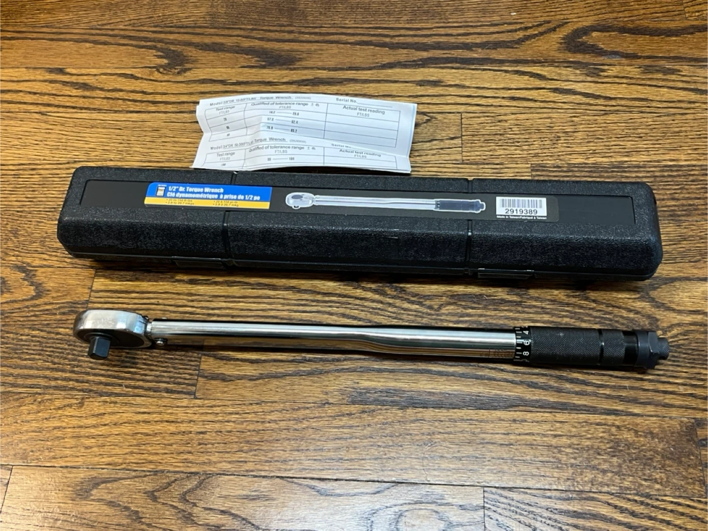 This is a brand new 1/2" drive torque wrench, great for automotive or mechanical work. It comes with its original carrying case for protection. This wrench is essential for applying precise torque values to fasteners.