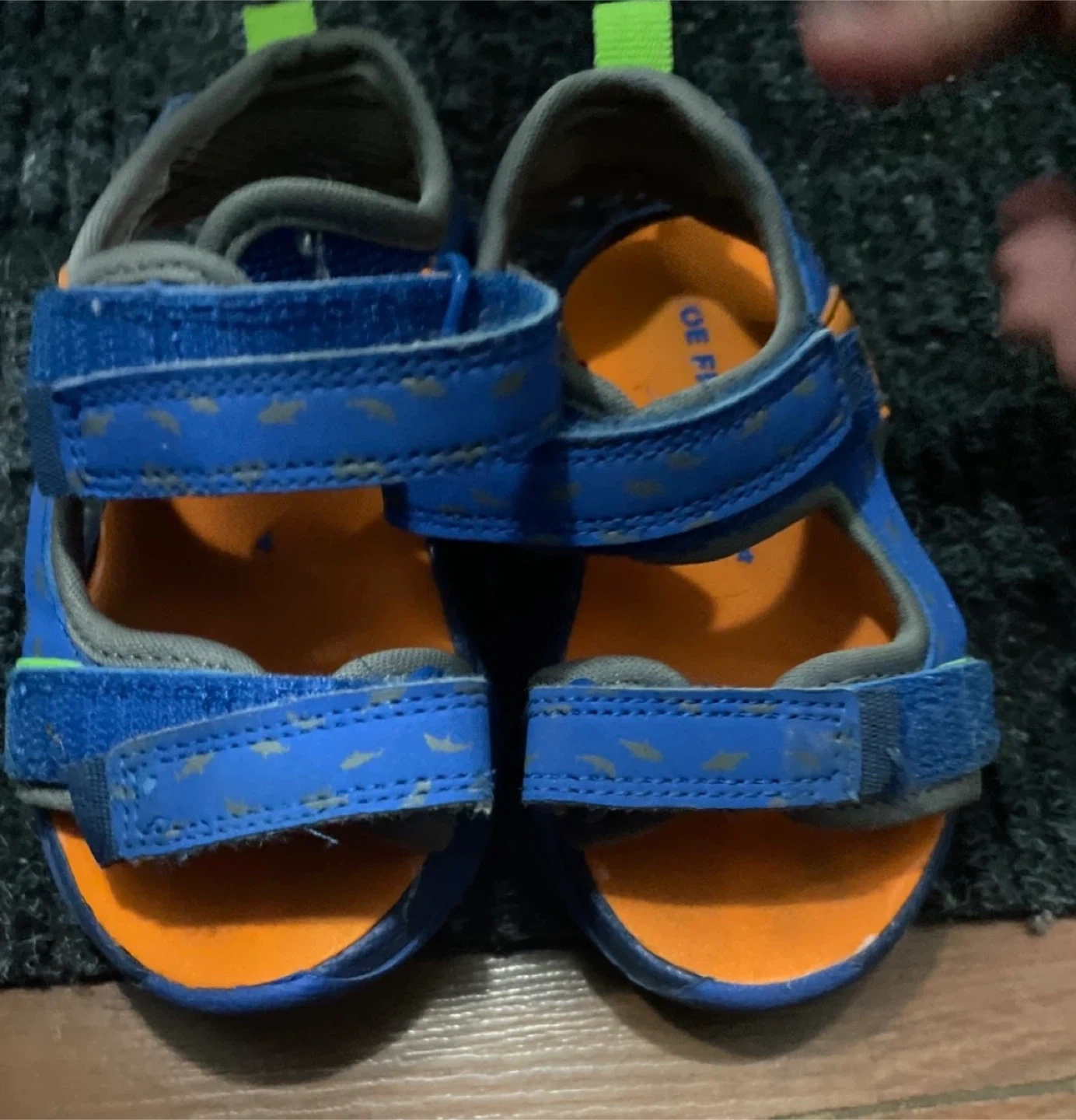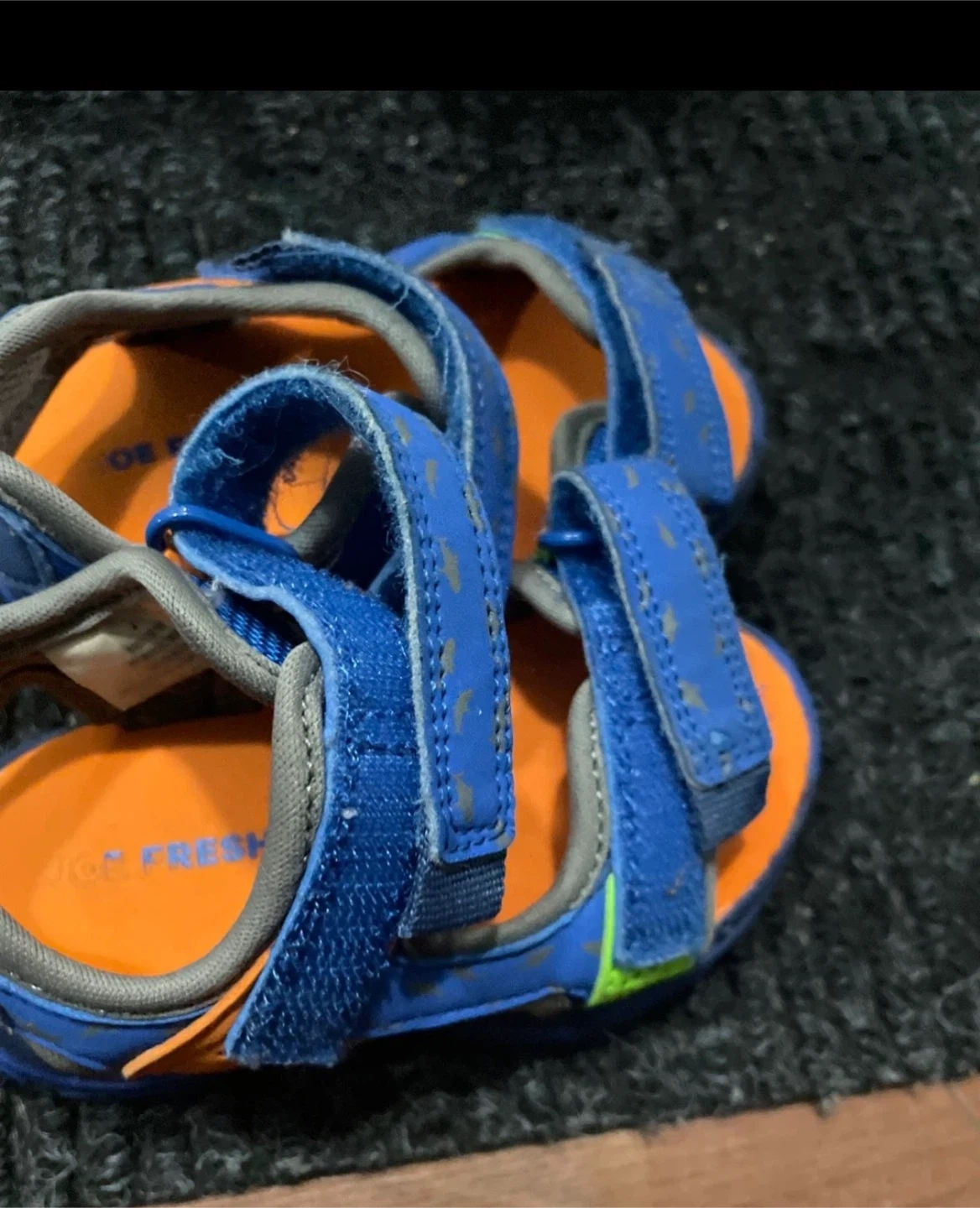 These are kid-sized sandals in blue and orange. They feature adjustable velcro straps for a secure fit. Great for active little ones during warmer weather!